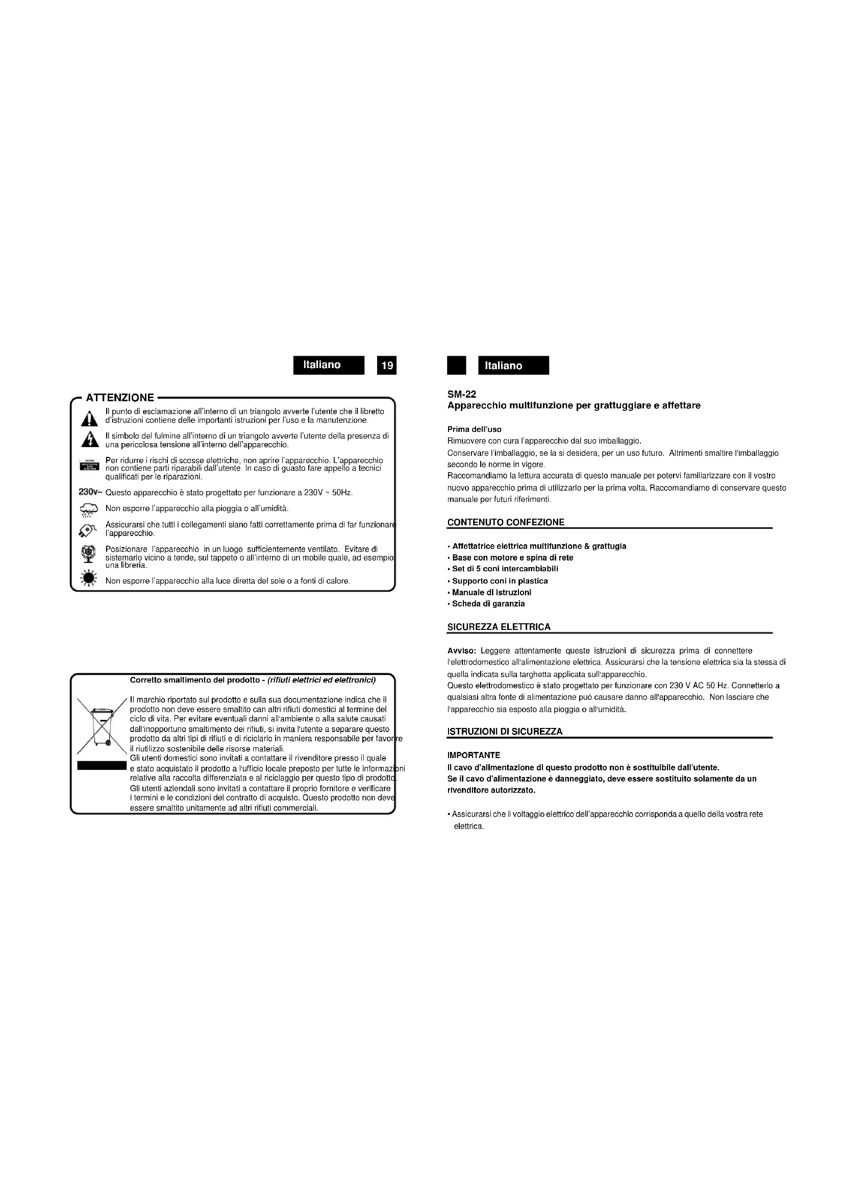 - Allorché si decide di smaltire come rifiuto quello apparecchio, si raccomanda di renderlo inoperante tagliandone il cavo di alimentazione. Si raccomanda inolte di renderre innocue quella parti dell'apparechio scuscittiibi di costituire un pericolo, specialmente per i bambini che potrebbero servisi dell'aparchio per i propri giochi.