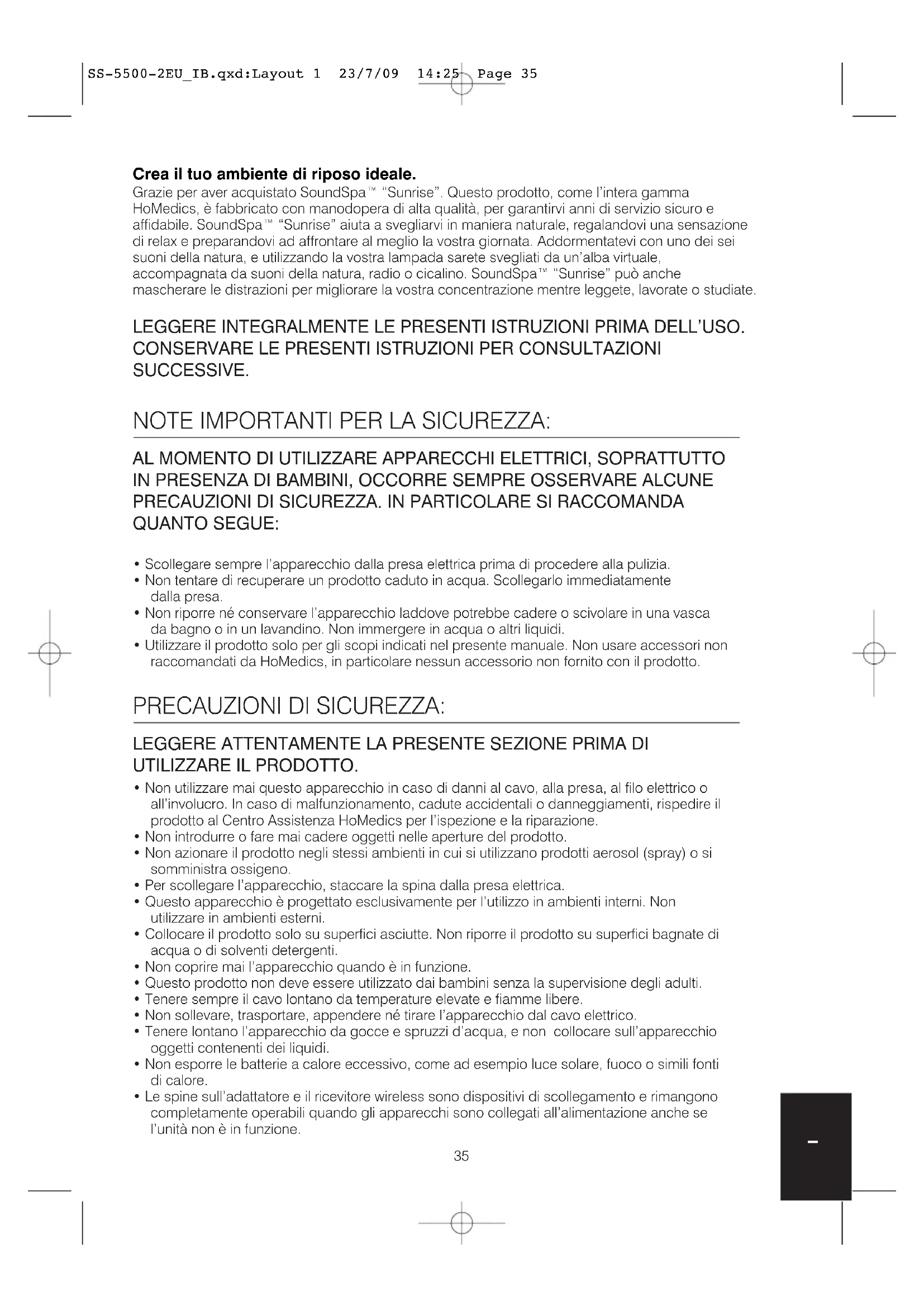 SS-5500-2EU_IB.qxd:Layout 1 23/7/09 14:25 Page 3435 Crea il tuo ambiente di riposo ideale. Grazie per aver acquistato SoundSpa™ “Sunrise”. Questo prodotto, come l’intera gamma HoMedics, è fabbricato con manodopera di alta qualità, per garantirvi anni di servizio sicuro e affidabile. SoundSpa™ “Sunrise” aiuta a svegliarvi in maniera naturale, regalandovi una sensazione di relax e preparandovi ad affrontare al meglio la vostra giornata. Addormentatevi con uno dei sei suoni della natura, e utilizzando la vostra lampada sarete svegliati da un’alba virtuale, accompagnata da suoni della natura, radio o cicalino. SoundSpa™ “Sunrise” può anche mascherare le distrazioni per migliorare la vostra concentrazione mentre leggete, lavorate o studiate. LEGGERE INTEGRALMENTE LE PRESENTI ISTRUZIONI PRIMA DELL’USO.