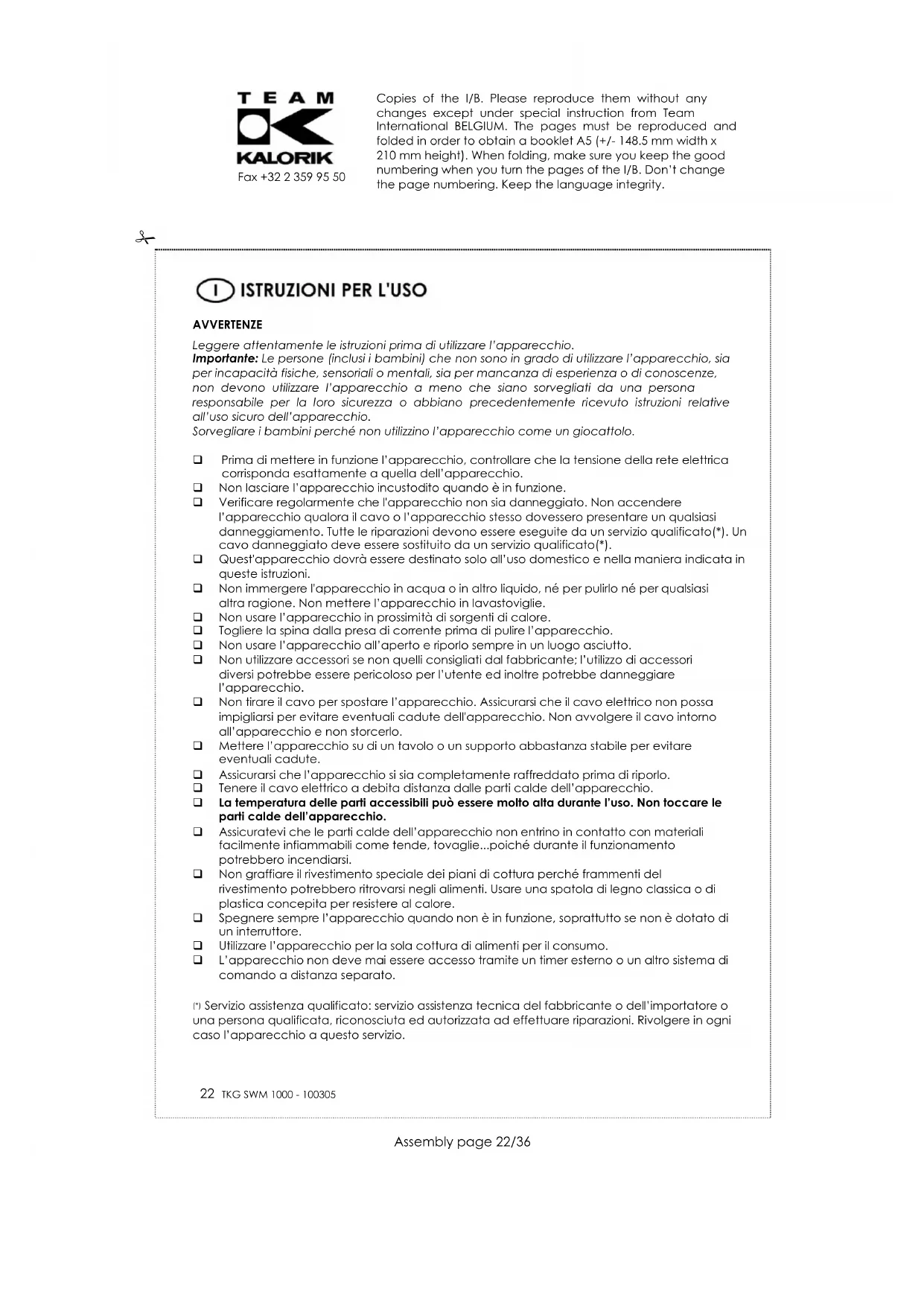 PULIZIA Prima di pulire l’apparecchio, scollegare la spina e lasciarlo raffreddare. Asciugare la parte esterna dell’apparecchio con un panno leggermente umido, assicurarsi che l’umidità, olio ed il grasso di cottura non si infiltrino all’interno delle asole di raffreddamento dell’apparecchio. Per pullire le piastre, potete lasciarle nell'apparecchio, o toglierle (spingere sul pulsante 2 che si trova accanto la maniglia e toglierle (vedi il disegno)). Se lasciate le piastre nell'apparecchio, pulirle con un pezzo di carta assorbente o con uno straccio. Se togliete le piastre dall'apparecchio, potete lavarle sott' acqua corrente. Asciugare bene le piastre. Non mettere nella lavastoglie. Non pulire l’apparecchio (sia la parte interna che esterna) con prodotti abrasivi per non rovinare il rivestimento. Non immergere l’apparecchio in acqua o in altri liquidi. DIRETTIVA 2002/96/CE PER LO SMALTIMENTO DELLE APPARECCHIATURE ELETTRICHE ED ELETTRONICHE Per preservare l'ambiente e la nostra salute, i vecchi apparecchi elettrici e elettronici non più utilizzati devono essere smaltiti secondo la direttiva sopra citata che impone l'obbligo al costruttore, al commerciante e all'utilizzatore di consegnare gli apparecchi ai centri di raccolta specializzati, i quali saranno in grado di smaltire e riciclare i vecchi prodotti come la legge prescrive. Per questa ragione troverete apposto sulla targhetta identificativa o sull'imballaggio il simbolo che indica di non gettare il vecchio apparecchio in pattumiera o nel cassonetto delle immondizie. Per eliminare il vecchio apparecchio non più utilizzato, potete consegnarlo al rivenditore il cambio di quello nuovo acquistato, o direttamente nei centri di raccolta specializzati messi a disposizione dal vostro comune di residenza. Copies of the I/B. Please reproduce them without any changes except under special instruction from Team International BELGIUM. The pages must be reproduced and folded in order to obtain a booklet A5 (+/- 148.5 mm width x 210 mm height). When folding, make sure you keep the good numbering when you turn the pages of the I/B. Don’t change the page numbering. Keep the language integrity.