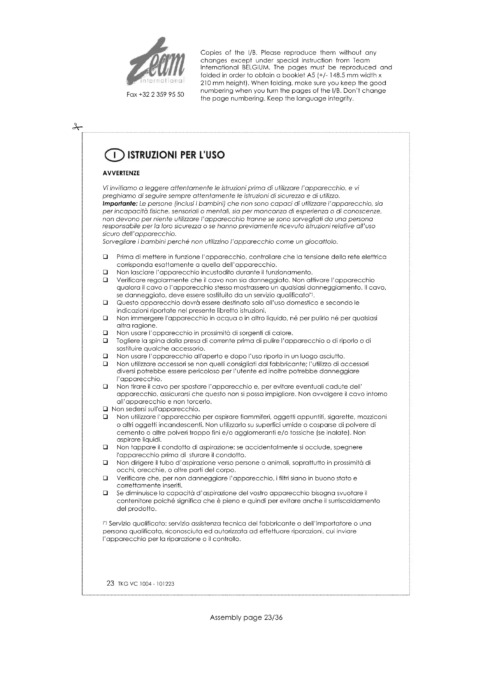 ^1) Servizio qualificato: servizio assistenza tecnica del fabbricante o dell'importatore o una persona qualificata, riconosciuta ed autorizzata ad effettuare riparazioni, cui INViare l'apparecchio per la riparazione o il controllo.