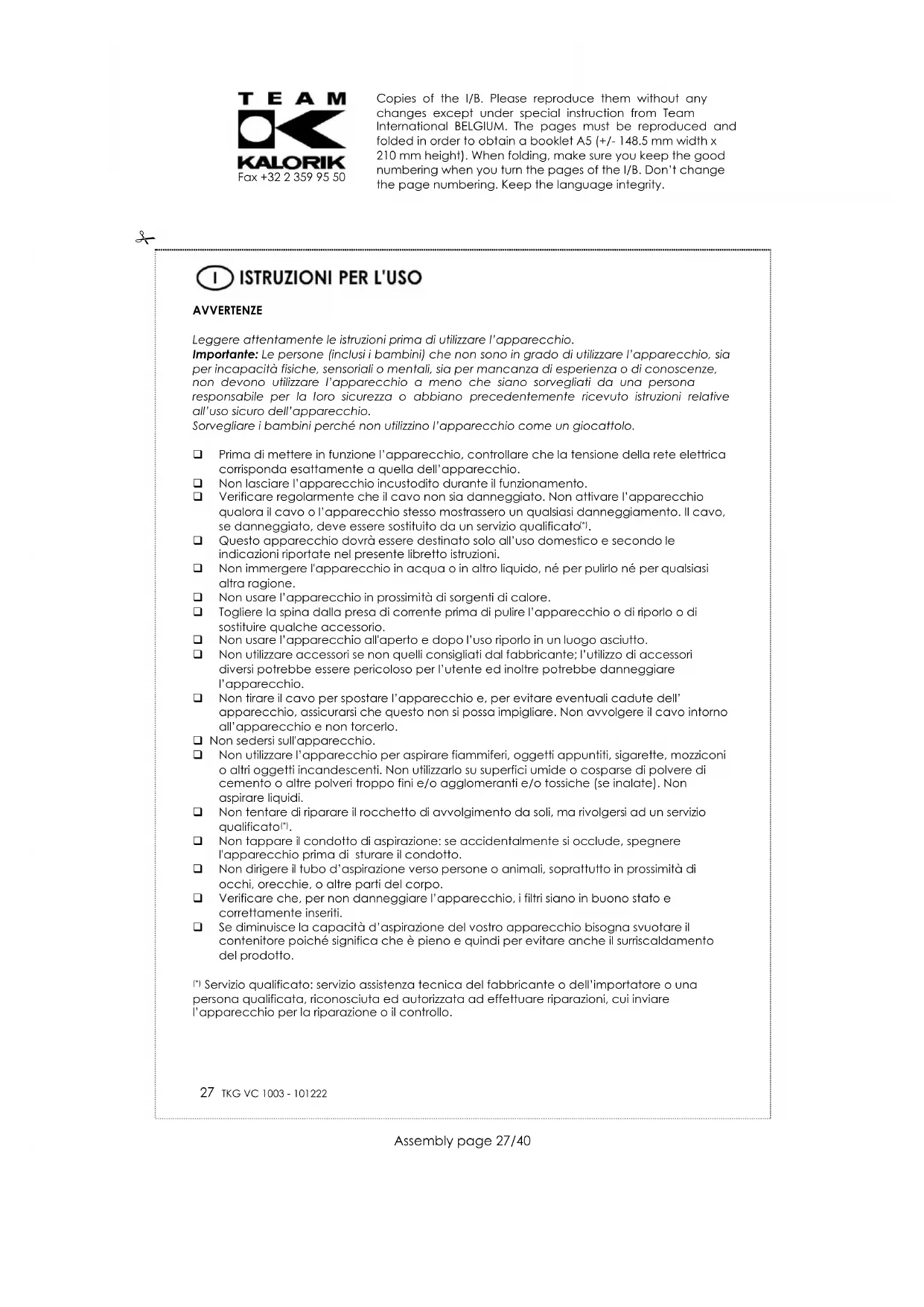 MANUALE UTENTE TKG VC 1003 KALORIK