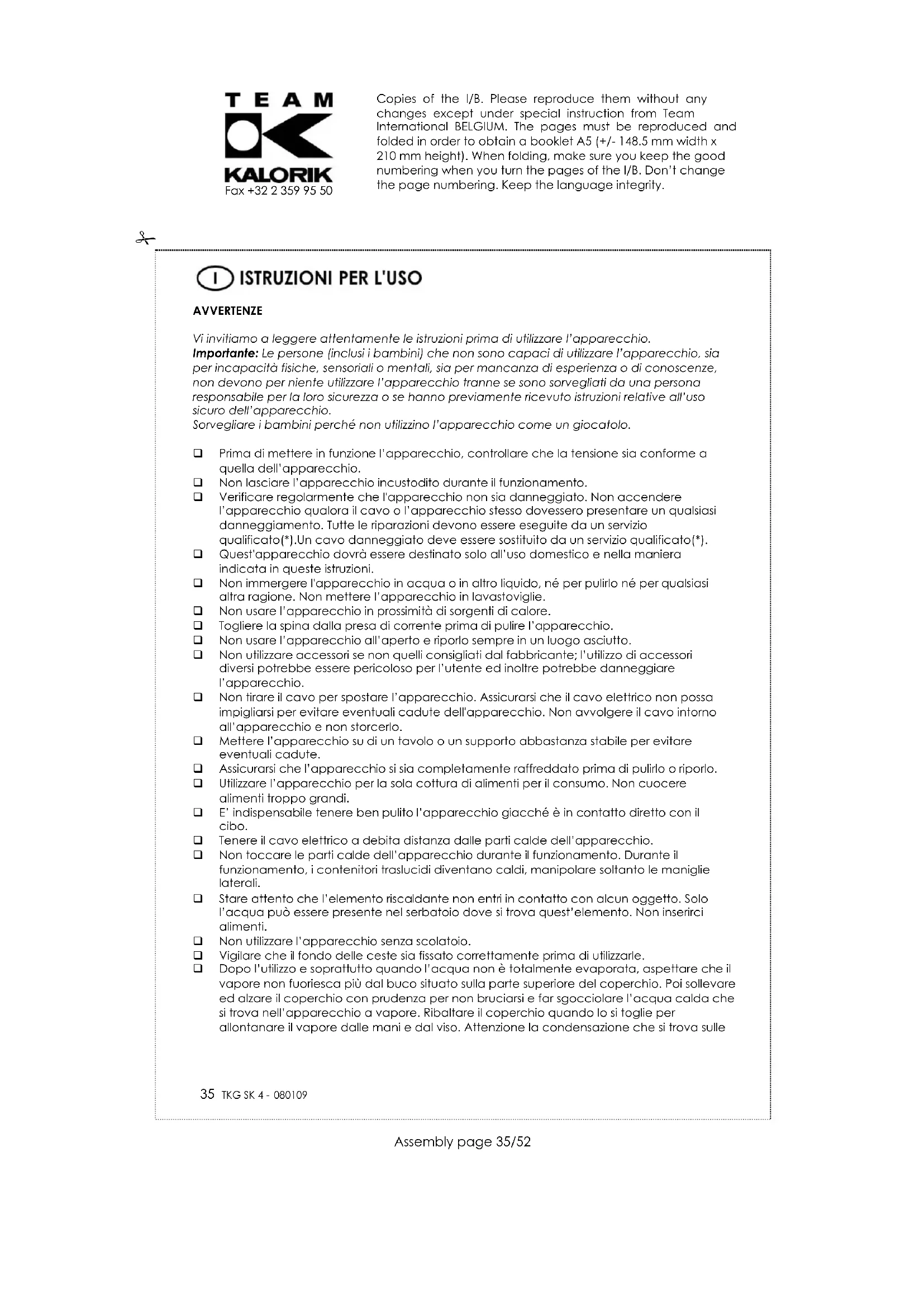 Fax +32 2 359 95 50 DIRETTIVA 2002/96/CE SULLO SMALTIMENTO DI APPARECCHI ELETTRICI ED ELETTRONICI Per preservare l'ambiente e la nostra salute, l'eliminazione dei vecchi apparecchi elettrici ed elettronici non più utilizzati, va fatta secondo la direttiva sopra citata che impone l'obbligo al costruttore, al commerciante e all’utilizzatore di consegnare gli apparecchi ai centri di raccolta specializzati, i quali saranno in grado di smaltire e riciclare i vecchi prodotti come la legge prescrive. Per questa ragione troverete apposto sull’etichetta segnaletica il simbolo che indica di non gettare il vecchio apparecchio non più utilizzato, in pattumiera o nel cassonetto delle immondizie. Per eliminare il vecchio apparecchio non più utilizzato, potete consegnarlo al rivenditore il cambio di quello nuovo acquistato, o direttamente nei centri di raccolta specializzati messi a disposizione dal vostro comune di residenza. Copies of the I/B. Please reproduce them without any changes except under special instruction from Team International BELGIUM. The pages must be reproduced and folded in order to obtain a booklet A5 (+/- 148.5 mm width x 210 mm height). When folding, make sure you keep the good numbering when you turn the pages of the I/B. Don’t change the page numbering. Keep the language integrity.