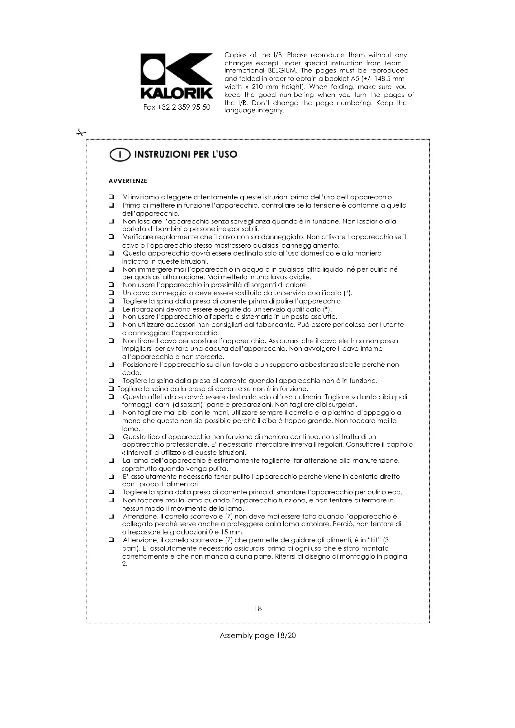 Prima di eseguire le normali operazioni di pulizia, spegnere l'apparecchio e togliere la spina dalla presa di corrente. Asciugare l'apparecchio con carta assorbente o un panno morbido e leggermente umido. Non utilizzare polveri o prodotti abrasivi, in quando potrebbero danneggiare l'apparecchio. Non immergere l'apparecchio in acqua o in altri liquidi o in lavastoviglie. E' possibile staccare la lama svitando la vite di fissaggio (1) in senso orario. Fare particolare attenzione in quanto la stessa e estremamente tagliente. Pulirla con acqua e sapone, e sciacquare. Riporre la lama nel suo alloggio avvitando accuratamente la vite di fissaggio in senso antiorario. Asciugare bene tutte le parti dell'apparecchio prima di riporlo. Copies of the I/B. Please reproduce them without any changes except under special instruction from Team International BELGIUM. The pages must be reproduced and folded in order to obtain a booklet A5 (+/- 148.5 mm width x 210 mm height). When folding, make sure you keep the good numbering when you turn the pages of the I/B. Don’t change the page numbering. Keep the language integrity.