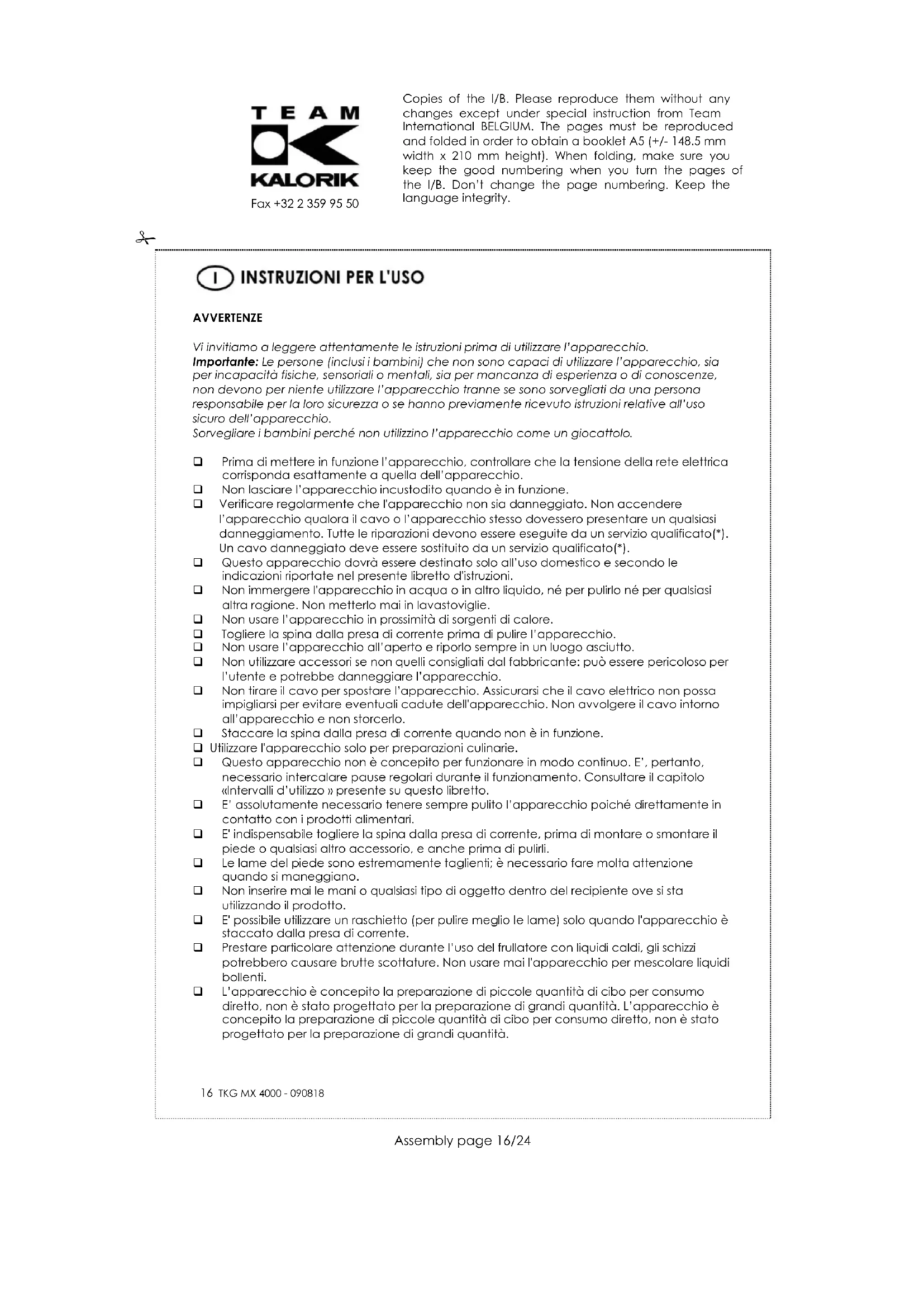 DIRETTIVA 2002/96/CE PER LO SMALTIMENTO DELLE APPARECCHIATURE ELETTRICHE ED ELETTRONICHE Per preservare l'ambiente e la nostra salute, l'eliminazione dei vecchi apparecchi elettrici e elettronici non più utilizzati, va fatta secondo la direttiva sopra citata che impone l'obbligo al costruttore, al commerciante e a l'utilizzatore di consegnare gli apparecchi ai centri di raccolta specializzati, i quali saranno in grado di smaltire e riciclare i vecchi prodotti come la legge prescrive. Per questa ragione troverete apposto sull'etichetta segnaletica il simbolo che indica di non gettare il vecchio apparecchio non più utilizzato, in pattumiera o nel cassonetto delle immondizie. Per eliminare il vecchio apparecchio non più utilizzato, potete consegnarlo al rivenditore il cambio di quello nuovo acquistato, o direttamente nei centri di raccolta specializzati messi a disposizione dal vostro comune di residenza. Copies of the I/B. Please reproduce them without any changes except under special instruction from Team International BELGIUM. The pages must be reproduced and folded in order to obtain a booklet A5 (+/- 148.5 mm width x 210 mm height). When folding, make sure you keep the good numbering when you turn the pages of the I/B. Don’t change the page numbering. Keep the language integrity.