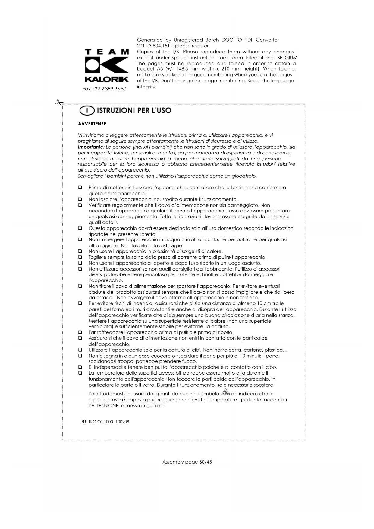 Questo apparecchio dovrà essere destinato solo all’uso domestico secondo le indicazioni riportate nel presente libretto. Non immergere l'apparecchio in acqua o in altro liquido, né per pulirlo né per qualsiasi altra ragione. Non lavarlo in lavastoviglie. Non usare l’apparecchio in prossimità di sorgenti di calore. Togliere sempre la spina dalla presa di corrente prima di pulire l’apparecchio. Non usare l’apparecchio all'aperto e dopo l'uso riporlo in un luogo asciutto. Non utilizzare accessori se non quelli consigliati dal fabbricante; l’utilizzo di accessori diversi potrebbe essere pericoloso per l’utente ed inoltre potrebbe danneggiare l’apparecchio. Non tirare il cavo d’alimentazione per spostare l’apparecchio. Per evitare eventuali cadute del prodotto assicurarsi sempre che il cavo non si possa impigliare e che sia libero da ostacoli. Non avvolgere il cavo attorno all’apparecchio e non torcerlo. Per evitare rischi di incendio, assicurarsi che ci sia una distanza di almeno 10 cm tra le pareti del forno ed i muri circostanti e anche al disopra dell’apparecchio. Durante l’utilizzo dell’apparecchio verificate che ci sia sempre una buona circolazione d’aria nella stanza. Mettere l’apparecchio su una superficie resistente al calore (non una superficie verniciata) e sufficientemente stabile per evitarne la caduta. Far raffreddare l’apparecchio prima di pulirlo e prima di riporlo. Assicurarsi che il cavo di alimentazione non entri in contatto con le parti calde dell’apparecchio. Utilizzare l’apparecchio solo per la cottura di cibi. Non inerire carta, cartone, plastica… Non bisogna in alcun caso cuocere o riscaldare il pane per più di 10 minuti: il pane, scaldandosi troppo, potrebbe prendere fuoco. E’ indispensabile tenere ben pulito l’apparecchio poiché è a contatto con il cibo. La temperatura delle superfici accessibili potrebbe essere molto alta durante il funzionamento dell'apparecchio.Non toccare le parti calde dell’apparecchio, in particolare la porta o il vetro. Durante il funzionamento, se è necessario spostare l’elettrodomestico, usare dei guanti da cucina. Il simbolo sta ad indicare che la superficie ove è apposto può raggiungere elevate temperature ; pertanto accentua l’ATTENSIONE e messa in guardia.Generated by Unregistered Batch DOC TO PDF Converter 2011.3.804.1511, please register! Copies of the I/B. Please reproduce them without any changes except under special instruction from Team International BELGIUM. The pages must be reproduced and folded in order to obtain a booklet A5 (+/- 148.5 mm width x 210 mm height). When folding, make sure you keep the good numbering when you turn the pages of the I/B. Don’t change the page numbering. Keep the language integrity.