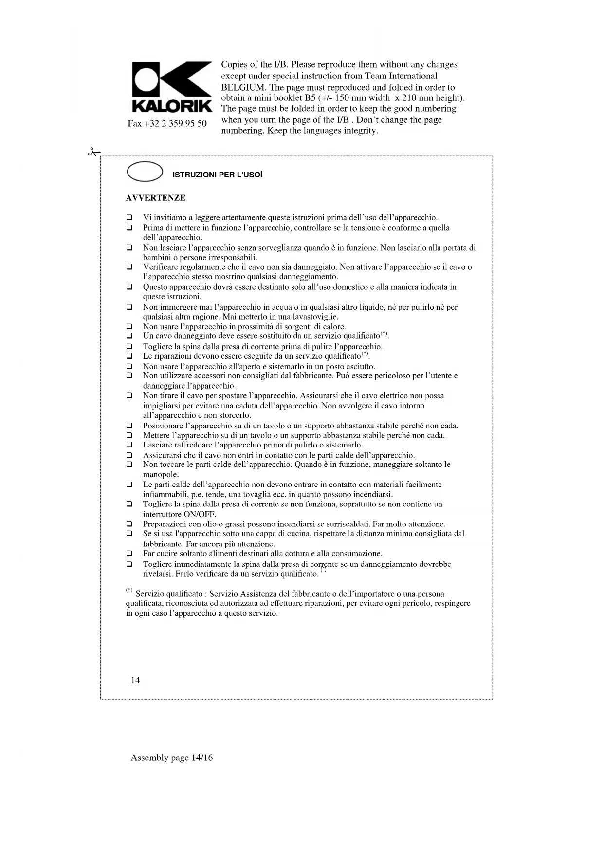 Togliere la spina dalla presa di corrente ed aspettare che l‟apparecchio si raffreddi prima di pulirlo. Asciugare l‟apparecchio con della carta assorbente o un panno morbido. Non pulire mai l‟apparecchio con pagliette metalliche o prodotti abrasivi per non rovinare il rivestimento. Non immergere l'apparecchio in acqua o in altri liquidi.Copies of the I/B. Please reproduce them without any changes except under special instruction from Team International BELGIUM. The page must reproduced and folded in order to obtain a mini booklet B5 (+/- 150 mm width x 210 mm height). The page must be folded in order to keep the good numbering when you turn the page of the I/B . Don‟t change the page numbering. Keep the languages integrity.