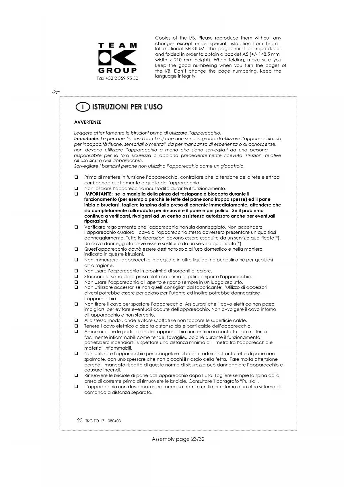 AVVERTENZE Leggere attentamente le istruzioni prima di utilizzare l’apparecchio. Importante: Le persone (inclusi i bambini) che non sono in grado di utilizzare l’apparecchio, sia per incapacità fisiche, sensoriali o mentali, sia per mancanza di esperienza o di conoscenze, non devono utilizzare l’apparecchio a meno che siano sorvegliati da una persona responsabile per la loro sicurezza o abbiano precedentemente ricevuto istruzioni relative all’uso sicuro dell’apparecchio. Sorvegliare i bambini perché non utilizzino l’apparecchio come un giocattolo. Prima di mettere in funzione l’apparecchio, controllare che la tensione della rete elettrica corrisponda esattamente a quella dell’apparecchio. Non lasciare l’apparecchio incustodito durante il funzionamento. IMPORTANTE: se la maniglia della pinza del tostapane è bloccata durante il funzionamento (per esempio perchè le fette del pane sono troppo spesse) ed il pane inizia a bruciarsi, togliere la spina dalla presa di corrente immediatamente, attendere che sia completamente raffreddato per rimuovere il pane e per pulirlo. Se il problema continua a verificarsi, rivolgersi ad un centro assistenza autorizzato anche per eventuali riparazioni. Verificare regolarmente che l'apparecchio non sia danneggiato. Non accendere l’apparecchio qualora il cavo o l’apparecchio stesso dovessero presentare un qualsiasi danneggiamento. Tutte le riparazioni devono essere eseguite da un servizio qualificato(*). Un cavo danneggiato deve essere sostituito da un servizio qualificato(*). Quest'apparecchio dovrà essere destinato solo all’uso domestico e nella maniera indicata in queste istruzioni. Non immergere l'apparecchio in acqua o in altro liquido, né per pulirlo né per qualsiasi altra ragione. Non usare l’apparecchio in prossimità di sorgenti di calore. Staccare la spina dalla presa elettrica prima di pulire o riporre l'apparecchio. Non usare l’apparecchio all’aperto e riporlo sempre in un luogo asciutto. Non utilizzare accessori se non quelli consigliati dal fabbricante; l’utilizzo di accessori diversi potrebbe essere pericoloso per l’utente ed inoltre potrebbe danneggiare l’apparecchio. Non tirare il cavo per spostare l’apparecchio. Assicurarsi che il cavo elettrico non possa impigliarsi per evitare eventuali cadute dell'apparecchio. Non avvolgere il cavo intorno all’apparecchio e non storcerlo. Allo stesso modo , onde evitare scottature non toccare le superficie calde. Tenere il cavo elettrico a debita distanza dalle parti calde dell’apparecchio. Assicurarsi che le parti calde dell’apparecchio non entrino in contatto con materiali facilmente infiammabili come tende, tovaglie...poiché durante il funzionamento potrebbero incendiarsi. Rispettare una distanza minima di 1 metro fra l’apparecchio e materiali infiammabili. Non utilizzare l'apparecchio per scongelare cibo e introdurre soltanto fette di pane non spalmate, con uno spessore che non blocchi il rilascio della fetta. Fare molta attenzione perché il mancato rispetto di queste norme di sicurezza può danneggiare l’apparecchio e causare incendi. Rimuovere le briciole di pane dall’apparecchio dopo l’uso. Togliere sempre la spina dalla presa di corrente prima di rimuovere le briciole. Consultare il paragrafo “Pulizia”. L’apparecchio non deve mai essere accesso tramite un timer esterno o un altro sistema di comando a distanza separato. Copies of the I/B. Please reproduce them without any changes except under special instruction from Team International BELGIUM. The pages must be reproduced and folded in order to obtain a booklet A5 (+/- 148.5 mm width x 210 mm height). When folding, make sure you keep the good numbering when you turn the pages of the I/B. Don’t change the page numbering. Keep the language integrity.