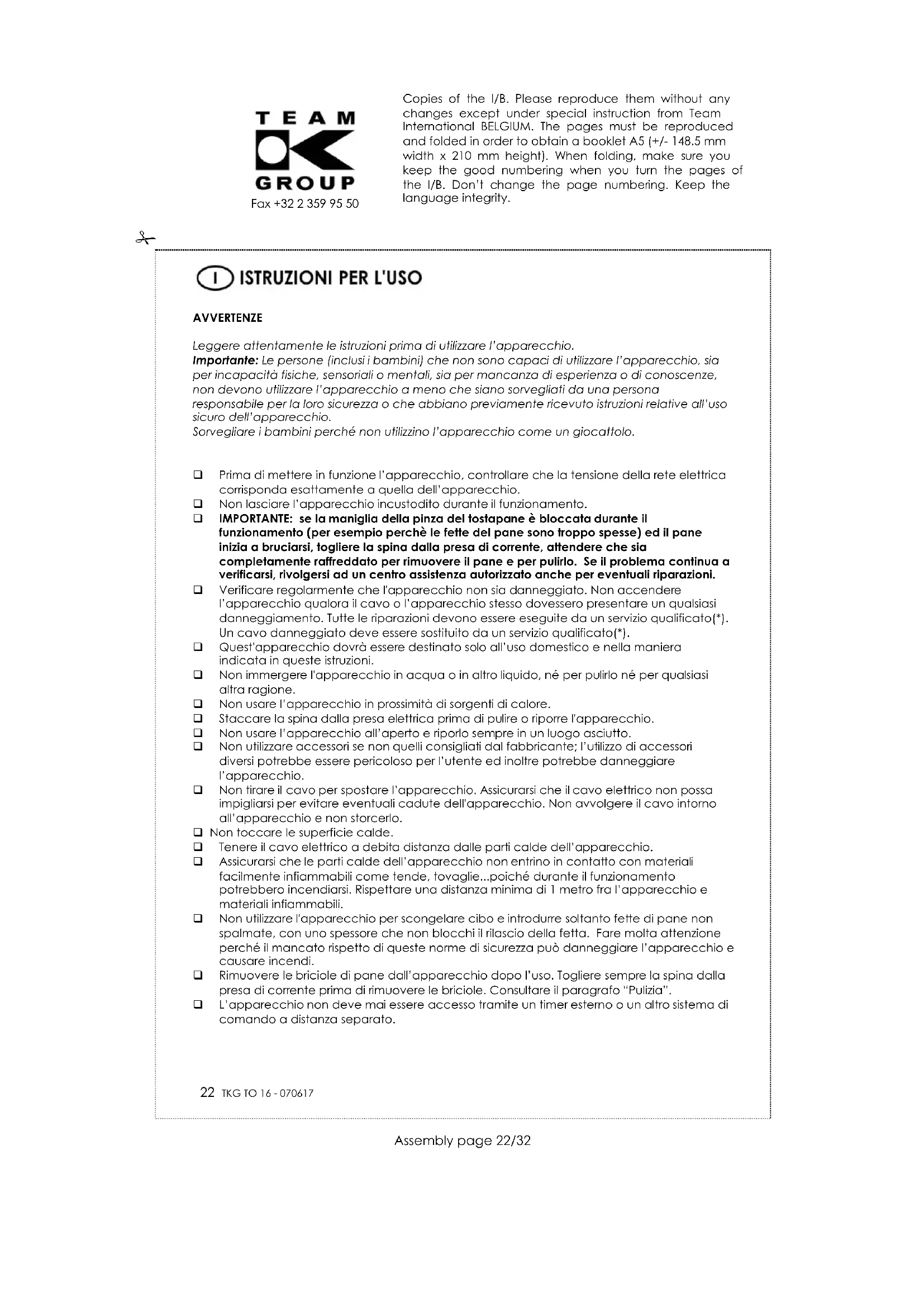 Prima di mettere in funzione l’apparecchio, controllare che la tensione della rete elettrica corrisponda esattamente a quella dell’apparecchio. Non lasciare l’apparecchio incustodito durante il funzionamento. IMPORTANTE: se la maniglia della pinza del tostapane è bloccata durante il funzionamento (per esempio perchè le fette del pane sono troppo spesse) ed il pane inizia a bruciarsi, togliere la spina dalla presa di corrente, attendere che sia completamente raffreddato per rimuovere il pane e per pulirlo. Se il problema continua a verificarsi, rivolgersi ad un centro assistenza autorizzato anche per eventuali riparazioni. Verificare regolarmente che l'apparecchio non sia danneggiato. Non accendere l’apparecchio qualora il cavo o l’apparecchio stesso dovessero presentare un qualsiasi danneggiamento. Tutte le riparazioni devono essere eseguite da un servizio qualificato(*). Un cavo danneggiato deve essere sostituito da un servizio qualificato(*). Quest'apparecchio dovrà essere destinato solo all’uso domestico e nella maniera indicata in queste istruzioni. Non immergere l'apparecchio in acqua o in altro liquido, né per pulirlo né per qualsiasi altra ragione. Non usare l’apparecchio in prossimità di sorgenti di calore. Staccare la spina dalla presa elettrica prima di pulire o riporre l'apparecchio. Non usare l’apparecchio all’aperto e riporlo sempre in un luogo asciutto. Non utilizzare accessori se non quelli consigliati dal fabbricante; l’utilizzo di accessori diversi potrebbe essere pericoloso per l’utente ed inoltre potrebbe danneggiare l’apparecchio. Non tirare il cavo per spostare l’apparecchio. Assicurarsi che il cavo elettrico non possa impigliarsi per evitare eventuali cadute dell'apparecchio. Non avvolgere il cavo intorno all’apparecchio e non storcerlo. Non toccare le superficie calde. Tenere il cavo elettrico a debita distanza dalle parti calde dell’apparecchio. Assicurarsi che le parti calde dell’apparecchio non entrino in contatto con materiali facilmente infiammabili come tende, tovaglie...poiché durante il funzionamento potrebbero incendiarsi. Rispettare una distanza minima di 1 metro fra l’apparecchio e materiali infiammabili. Non utilizzare l'apparecchio per scongelare cibo e introdurre soltanto fette di pane non spalmate, con uno spessore che non blocchi il rilascio della fetta. Fare molta attenzione perché il mancato rispetto di queste norme di sicurezza può danneggiare l’apparecchio e causare incendi. Rimuovere le briciole di pane dall’apparecchio dopo l’uso. Togliere sempre la spina dalla presa di corrente prima di rimuovere le briciole. Consultare il paragrafo “Pulizia”. L’apparecchio non deve mai essere accesso tramite un timer esterno o un altro sistema di comando a distanza separato. Copies of the I/B. Please reproduce them without any changes except under special instruction from Team International BELGIUM. The pages must be reproduced and folded in order to obtain a booklet A5 (+/- 148.5 mm width x 210 mm height). When folding, make sure you keep the good numbering when you turn the pages of the I/B. Don’t change the page numbering. Keep the language integrity.