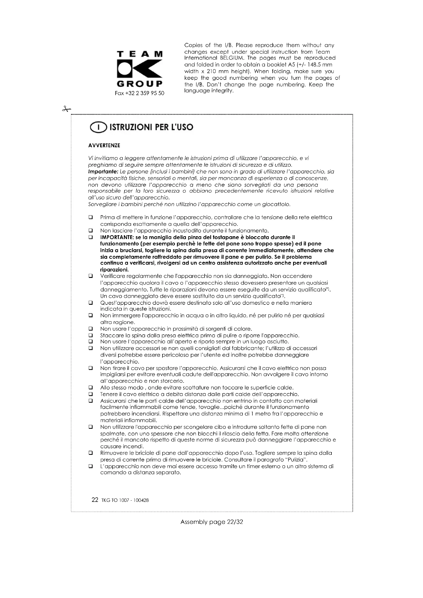 Quest'apparecchio dovrà essere destinato solo all’uso domestico e nella maniera indicata in queste istruzioni. Non immergere l'apparecchio in acqua o in altro liquido, né per pulirlo né per qualsiasi altra ragione. Non usare l’apparecchio in prossimità di sorgenti di calore. Staccare la spina dalla presa elettrica prima di pulire o riporre l'apparecchio. Non usare l’apparecchio all’aperto e riporlo sempre in un luogo asciutto. Non utilizzare accessori se non quelli consigliati dal fabbricante; l’utilizzo di accessori diversi potrebbe essere pericoloso per l’utente ed inoltre potrebbe danneggiare l’apparecchio. Non tirare il cavo per spostare l’apparecchio. Assicurarsi che il cavo elettrico non possa impigliarsi per evitare eventuali cadute dell'apparecchio. Non avvolgere il cavo intorno all’apparecchio e non storcerlo. Allo stesso modo , onde evitare scottature non toccare le superficie calde. Tenere il cavo elettrico a debita distanza dalle parti calde dell’apparecchio. Assicurarsi che le parti calde dell’apparecchio non entrino in contatto con materiali facilmente infiammabili come tende, tovaglie...poiché durante il funzionamento potrebbero incendiarsi. Rispettare una distanza minima di 1 metro fra l’apparecchio e materiali infiammabili. Non utilizzare l'apparecchio per scongelare cibo e introdurre soltanto fette di pane non spalmate, con uno spessore che non blocchi il rilascio della fetta. Fare molta attenzione perché il mancato rispetto di queste norme di sicurezza può danneggiare l’apparecchio e causare incendi. Rimuovere le briciole di pane dall’apparecchio dopo l’uso. Togliere sempre la spina dalla presa di corrente prima di rimuovere le briciole. Consultare il paragrafo “Pulizia”. L’apparecchio non deve mai essere accesso tramite un timer esterno o un altro sistema di comando a distanza separato. Copies of the I/B. Please reproduce them without any changes except under special instruction from Team International BELGIUM. The pages must be reproduced and folded in order to obtain a booklet A5 (+/- 148.5 mm width x 210 mm height). When folding, make sure you keep the good numbering when you turn the pages of the I/B. Don’t change the page numbering. Keep the language integrity.