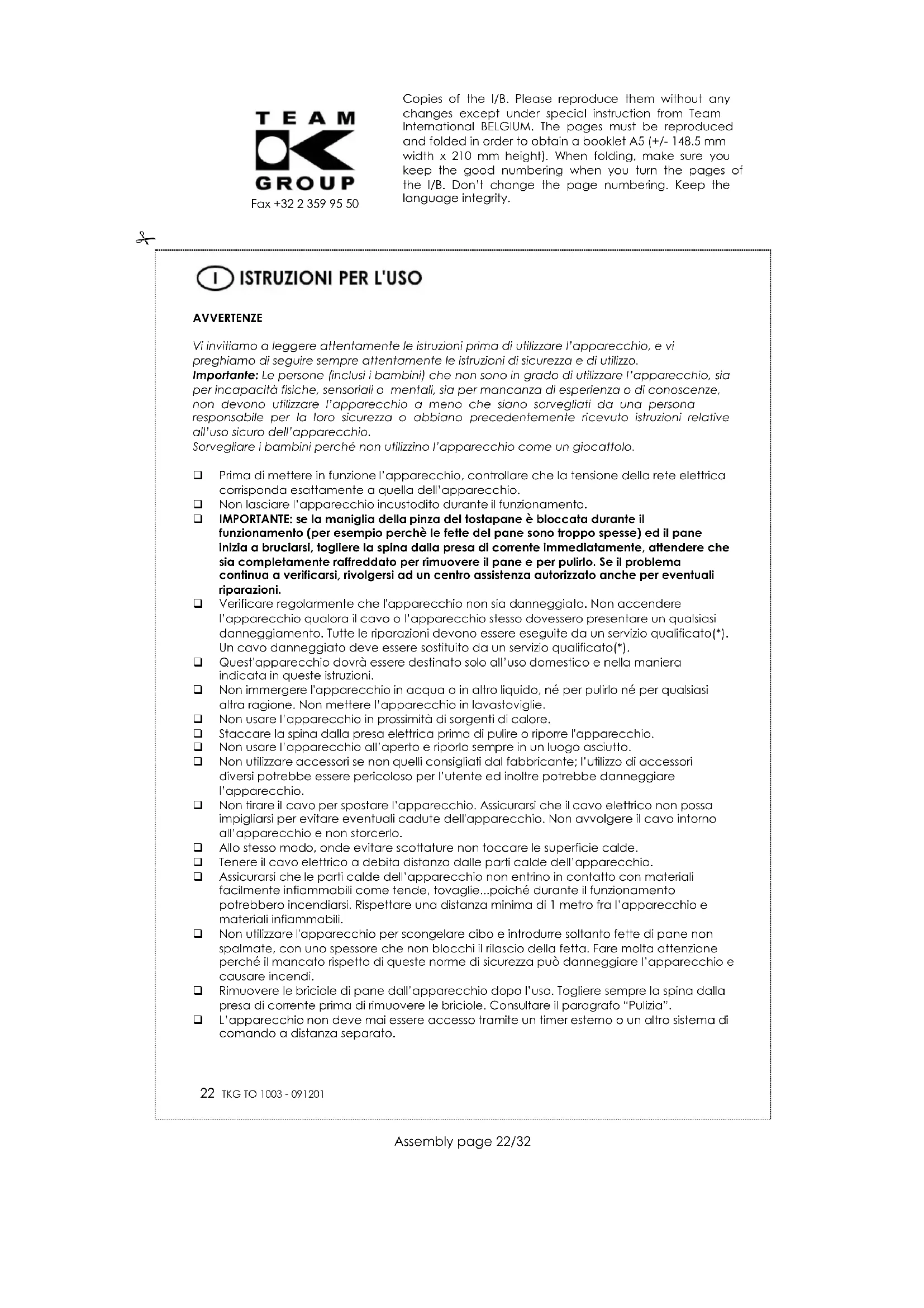 AVVERTENZE Vi invitiamo a leggere attentamente le istruzioni prima di utilizzare l’apparecchio, e vi preghiamo di seguire sempre attentamente le istruzioni di sicurezza e di utilizzo. Importante: Le persone (inclusi i bambini) che non sono in grado di utilizzare l’apparecchio, sia per incapacità fisiche, sensoriali o mentali, sia per mancanza di esperienza o di conoscenze, non devono utilizzare l’apparecchio a meno che siano sorvegliati da una persona responsabile per la loro sicurezza o abbiano precedentemente ricevuto istruzioni relative all’uso sicuro dell’apparecchio. Sorvegliare i bambini perché non utilizzino l’apparecchio come un giocattolo. Prima di mettere in funzione l’apparecchio, controllare che la tensione della rete elettrica corrisponda esattamente a quella dell’apparecchio. Non lasciare l’apparecchio incustodito durante il funzionamento. IMPORTANTE: se la maniglia della pinza del tostapane è bloccata durante il funzionamento (per esempio perchè le fette del pane sono troppo spesse) ed il pane inizia a bruciarsi, togliere la spina dalla presa di corrente immediatamente, attendere che sia completamente raffreddato per rimuovere il pane e per pulirlo. Se il problema continua a verificarsi, rivolgersi ad un centro assistenza autorizzato anche per eventuali riparazioni. Verificare regolarmente che l'apparecchio non sia danneggiato. Non accendere l’apparecchio qualora il cavo o l’apparecchio stesso dovessero presentare un qualsiasi danneggiamento. Tutte le riparazioni devono essere eseguite da un servizio qualificato(*). Un cavo danneggiato deve essere sostituito da un servizio qualificato(*). Quest'apparecchio dovrà essere destinato solo all’uso domestico e nella maniera indicata in queste istruzioni. Non immergere l'apparecchio in acqua o in altro liquido, né per pulirlo né per qualsiasi altra ragione. Non mettere l’apparecchio in lavastoviglie. Non usare l’apparecchio in prossimità di sorgenti di calore. Staccare la spina dalla presa elettrica prima di pulire o riporre l'apparecchio. Non usare l’apparecchio all’aperto e riporlo sempre in un luogo asciutto. Non utilizzare accessori se non quelli consigliati dal fabbricante; l’utilizzo di accessori diversi potrebbe essere pericoloso per l’utente ed inoltre potrebbe danneggiare l’apparecchio. Non tirare il cavo per spostare l’apparecchio. Assicurarsi che il cavo elettrico non possa impigliarsi per evitare eventuali cadute dell'apparecchio. Non avvolgere il cavo intorno all’apparecchio e non storcerlo. Allo stesso modo, onde evitare scottature non toccare le superficie calde. Tenere il cavo elettrico a debita distanza dalle parti calde dell’apparecchio. Assicurarsi che le parti calde dell’apparecchio non entrino in contatto con materiali facilmente infiammabili come tende, tovaglie...poiché durante il funzionamento potrebbero incendiarsi. Rispettare una distanza minima di 1 metro fra l’apparecchio e materiali infiammabili. Non utilizzare l'apparecchio per scongelare cibo e introdurre soltanto fette di pane non spalmate, con uno spessore che non blocchi il rilascio della fetta. Fare molta attenzione perché il mancato rispetto di queste norme di sicurezza può danneggiare l’apparecchio e causare incendi. Rimuovere le briciole di pane dall’apparecchio dopo l’uso. Togliere sempre la spina dalla presa di corrente prima di rimuovere le briciole. Consultare il paragrafo “Pulizia”. L’apparecchio non deve mai essere accesso tramite un timer esterno o un altro sistema di comando a distanza separato. Copies of the I/B. Please reproduce them without any changes except under special instruction from Team International BELGIUM. The pages must be reproduced and folded in order to obtain a booklet A5 (+/- 148.5 mm width x 210 mm height). When folding, make sure you keep the good numbering when you turn the pages of the I/B. Don’t change the page numbering. Keep the language integrity.