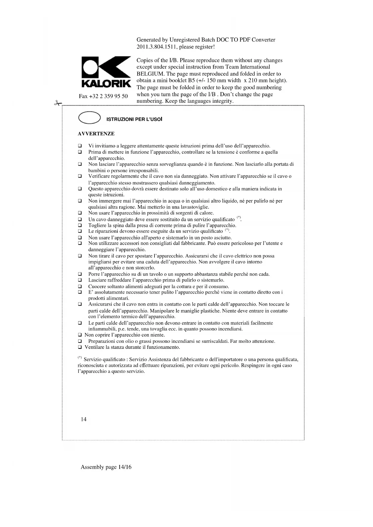 Prima di pulire, scollegare l'apparecchio e lasciarlo raffreddare. Non immergere l'apparecchio o la spina in acqua o in altri liquidi! Lavare il vassoio e la superficie di cottura con acqua calda e saponosa. Asciugare bene. Asciugare le parti esterne del grill con un panno leggermente umido ed asciugare bene. Non utilizzare mai prodotti abrasivi.Copies of the I/B. Please reproduce them without any changes except under special instruction from Team International BELGIUM. The page must reproduced and folded in order to obtain a mini booklet B5 (+/- 150 mm width x 210 mm height). The page must be folded in order to keep the good numbering when you turn the page of the I/B . Don’t change the page numbering. Keep the languages integrity.