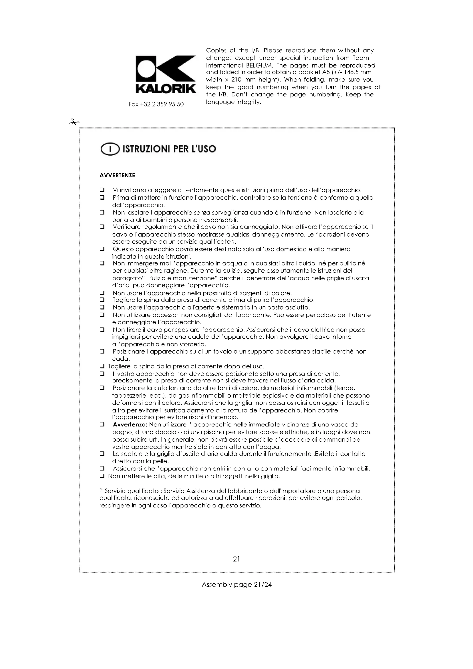 Questo apparecchio è dotato di un sistema di protezione contro il surriscaldamento che arresta automaticamente l'apparecchio in caso di surriscaldamento dovuto per esempio a l’ostruzione totale o parziale delle griglie. Se si verifica questo, spegnere l'apparecchio. Attendere 10 minuti, liberate le griglie e ricominciate la procedura di messa in funzione descritta al paragrafo precedente. Questa operazione è sufficiente per interrompere il sistema di protezione. Se il fenomeno persiste o l’apparecchio non demarra, rivolgetevi al servizio dopo vendita il più vicino al vostro domicilio. Copies of the I/B. Please reproduce them without any changes except under special instruction from Team International BELGIUM. The pages must be reproduced and folded in order to obtain a booklet A5 (+/- 148.5 mm width x 210 mm height). When folding, make sure you keep the good numbering when you turn the pages of the I/B. Don’t change the page numbering. Keep the language integrity.