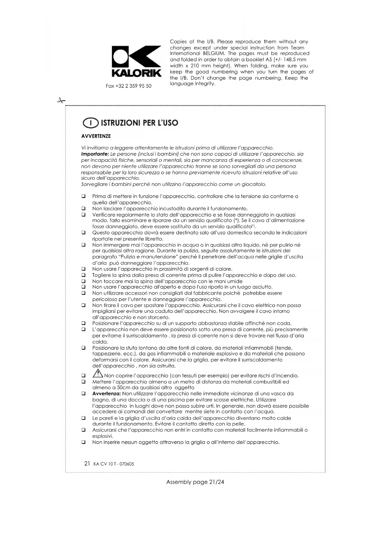 Questo apparecchio dovrà essere destinato solo all’uso domestico secondo le indicazioni riportate nel presente libretto. Non immergere mai l’apparecchio in acqua o in qualsiasi altro liquido, né per pulirlo né per qualsiasi altra ragione. Durante la pulizia, seguite assolutamente le istruzioni del paragrafo “Pulizia e manutenzione” perché il penetrare dell’acqua nelle griglie d’uscita d’aria può danneggiare l’apparecchio. Non usare l’apparecchio in prossimità di sorgenti di calore. Togliere la spina dalla presa di corrente prima di pulire l’apparecchio e dopo del uso. Non toccare mai la spina dell’apparecchio con le mani umide Non usare l’apparecchio all'aperto e dopo l'uso riporlo in un luogo asciutto. Non utilizzare accessori non consigliati dal fabbricante poiché potrebbe essere pericoloso per l’utente e danneggiare l’apparecchio. Non tirare il cavo per spostare l’apparecchio. Assicurarsi che il cavo elettrico non possa impigliarsi per evitare una caduta dell’apparecchio. Non avvolgere il cavo intorno all’apparecchio e non storcerlo. Posizionare l’apparecchio su di un supporto abbastanza stabile affinchè non cada. L’apparecchio non deve essere posizionato sotto una presa di corrente, più precisamente per evitarne il surriscaldamento , la presa di corrente non si deve trovare nel flusso d’aria calda. Posizionare la stufa lontano da altre fonti di calore, da materiali infiammabili (tende, tappezzerie, ecc.), da gas infiammabili o materiale esplosivo e da materiali che possono deformarsi con il calore. Assicurarsi che la griglia, per evitare il surriscaldamento dell’apparecchio , non sia ostruita. Non coprire l’apparecchio (con tessuti per esempio) per evitare rischi d’incendio. Mettere l’apparecchio almeno a un metro di distanza da materiali combustibili ed almeno a 50cm da qualsiasi altro oggetto Avvertenza: Non utilizzare l’apparecchio nelle immediate vicinanze di una vasca da bagno, di una doccia o di una piscina per evitare scosse elettriche. Utilizzare l’apparecchio in luoghi dove non possa subire urti. In generale, non dovrà essere possibile accedere ai comandi del convettore mentre siete in contatto con l’acqua. Le pareti e la griglia d’uscita d’aria calda dell’apparecchio diventano molto calde durante il funzionamento. Evitare il contatto diretto con la pelle. Assicurarsi che l’apparecchio non entri in contatto con materiali facilmente infiammabili o esplosivi. Non inserire nessun oggetto attraverso la griglia o all’interno dell’apparecchio. Copies of the I/B. Please reproduce them without any changes except under special instruction from Team International BELGIUM. The pages must be reproduced and folded in order to obtain a booklet A5 (+/- 148.5 mm width x 210 mm height). When folding, make sure you keep the good numbering when you turn the pages of the I/B. Don’t change the page numbering. Keep the language integrity. 22 KA CV 10 T - 070605