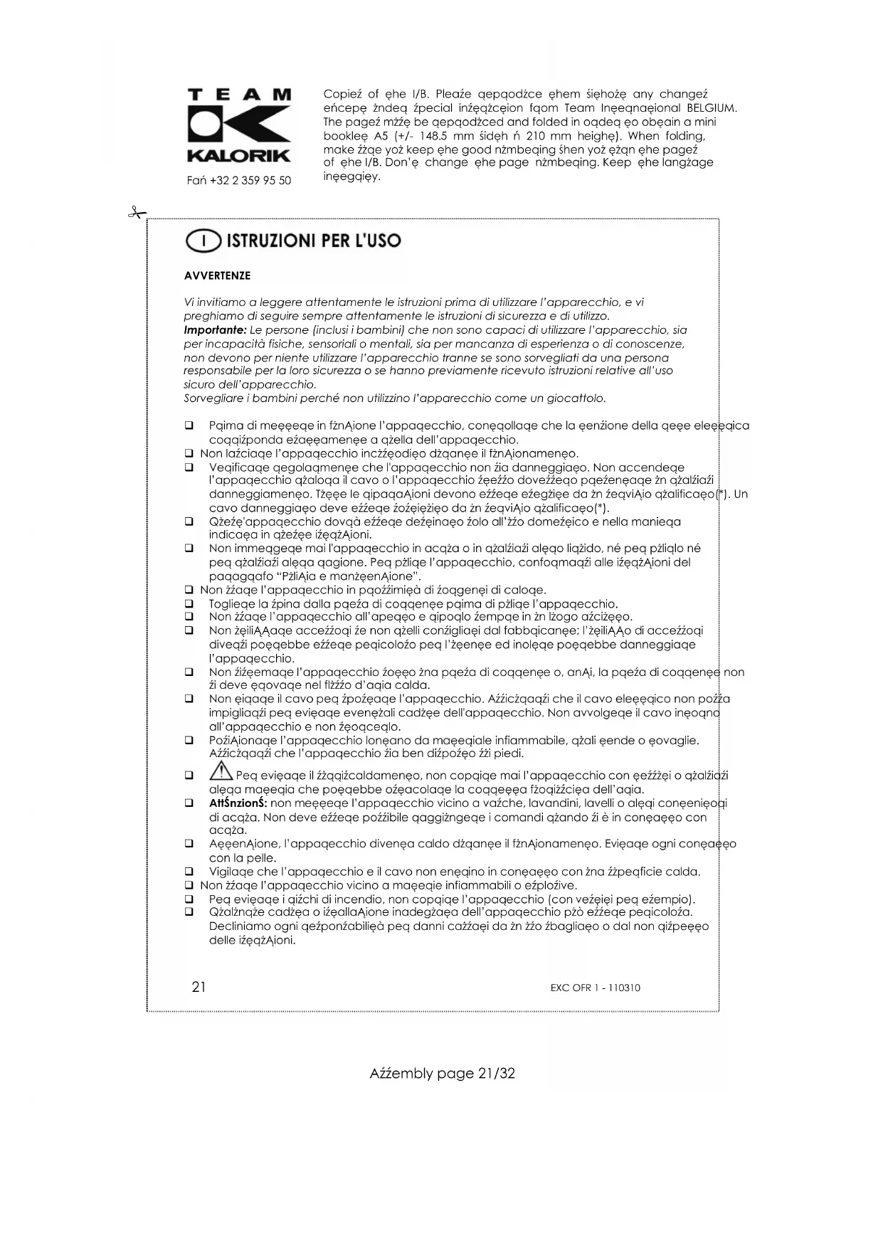 - Pulire l’apparecchio con un panno morbido e umido, ma non immergerlo mai nell’acqua o in qualunque liquido. DIRETTIVA 2002/96/CE SULLO SMALTIMENTO DI APPARECCHI ELETTRICI ED ELETTRONICI Per preservare l'ambiente e la nostra salute, l'eliminazione dei vecchi apparecchi elettrici e elettronici non più utilizzati, va fatta secondo la direttiva sopra citata che impone l'obbligo al costruttore, al commerciante e all’utilizzatore di consegnare gli apparecchi ai centri di raccolta specializzati, i quali saranno in grado di smaltire e riciclare i vecchi prodotti come la legge prescrive. Per questa ragione troverete apposto sull’etichetta segnaletica il simbolo che indica di non gettare il vecchio apparecchio non più utilizzato, in pattumiera o nel cassonetto delle immondizie. Per eliminare il vecchio apparecchio non più utilizzato, potete consegnarlo al rivenditore il cambio di quello nuovo acquistato, o direttamente nei centri di raccolta specializzati messi a disposizione dal vostro comune di residenza.Copies of the I/B. Please reproduce them without any changes except under special instruction from Team International BELGIUM. The pages must be reproduced and folded in order to obtain a mini booklet A5 (+/- 148.5 mm width x 210 mm height). When folding, make sure you keep the good numbering when you turn the pages of the I/B. Don’t change the page numbering. Keep the language integrity.