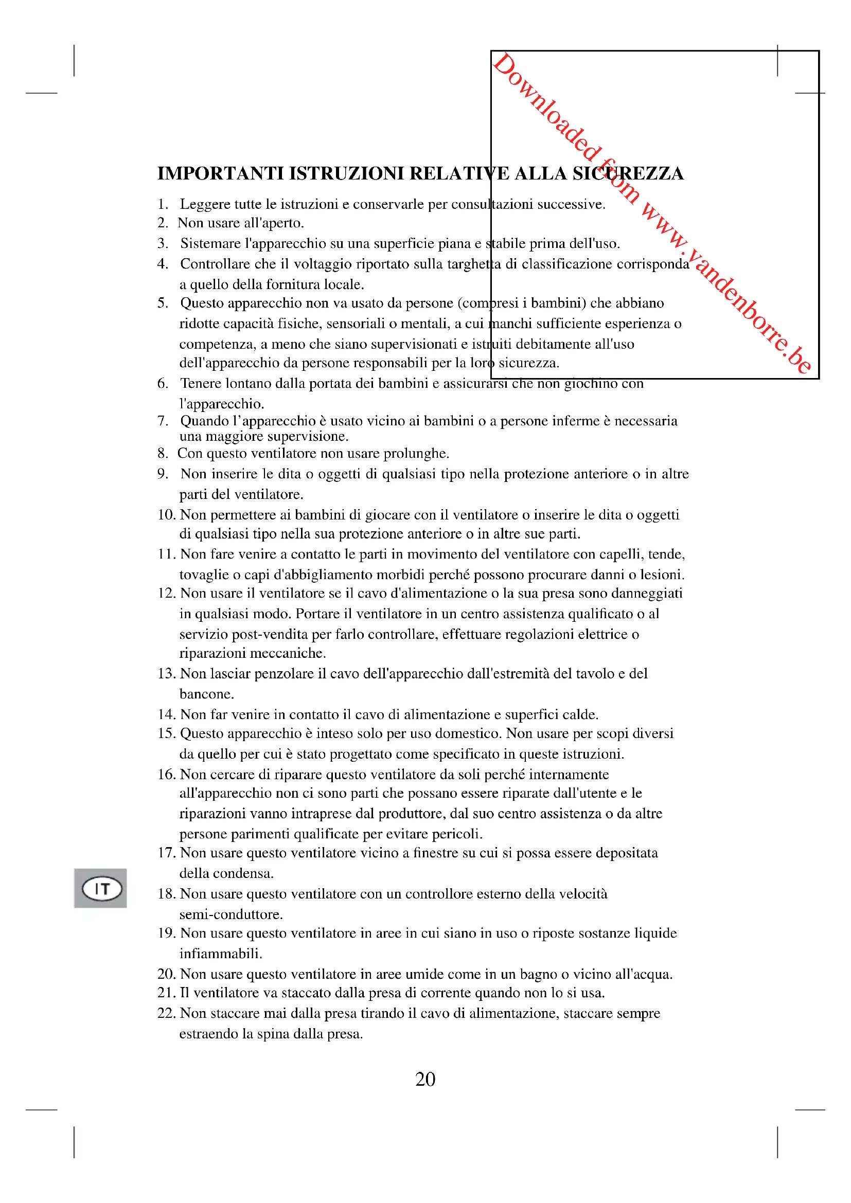 20. Non usare questo ventilatore in aree umide come in un bagno o vicino all'acqua.