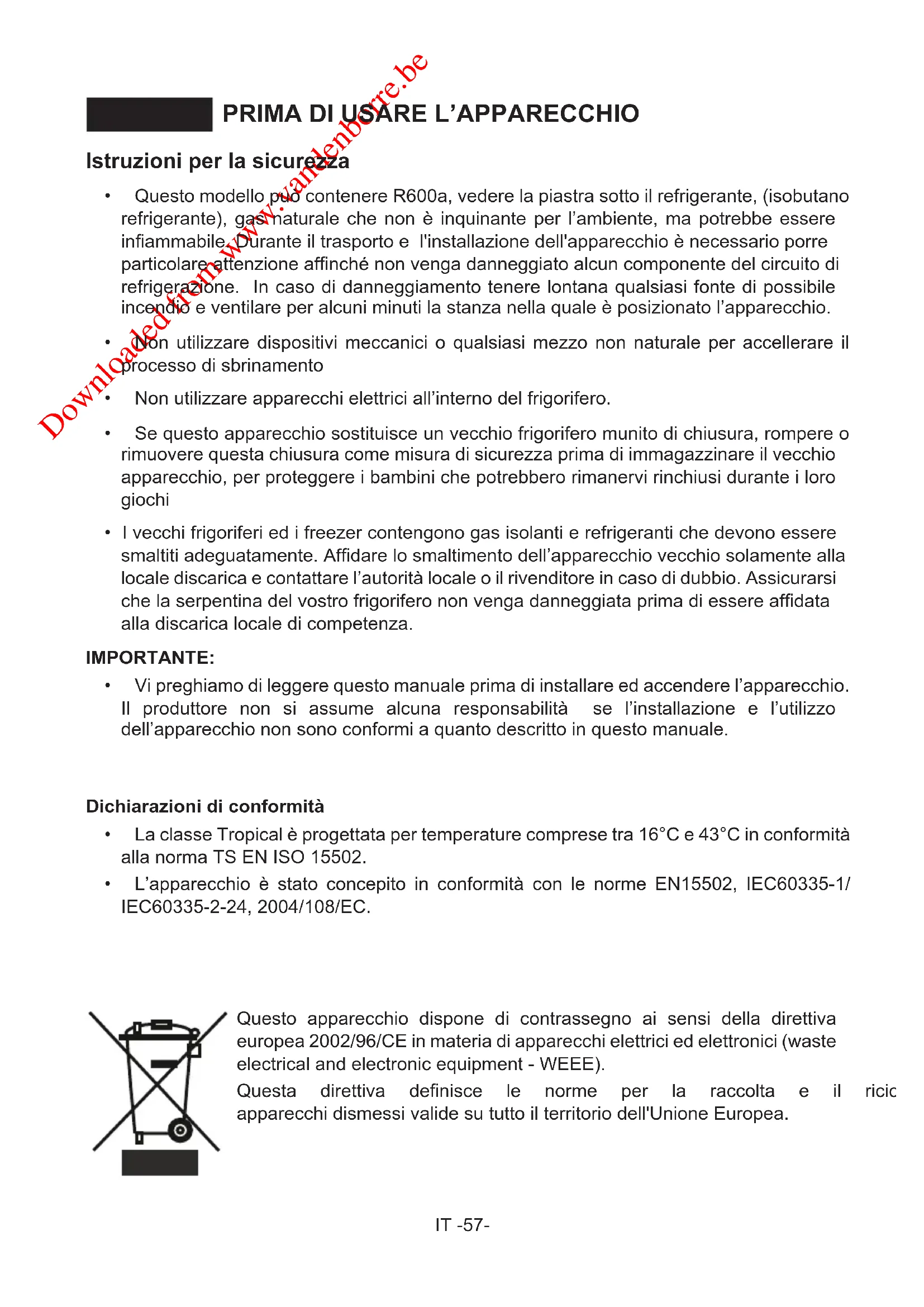 - L’apparecchio è stato concepito in conformità con le norme EN15502, IEC60335-1/ IEC60335-2-24, 2004/108/EC. Questo apparecchio dispone di contrassegno ai sensi della direttiva europea 2002/96/CE in materia di apparecchi elettrici ed elettronici (waste electrical and electronic equipment - WEEE). Questa direttiva denisce le norme per la raccolta e il riciclaggio degli apparecchi dismessi valide su tutto il territorio dell'Unione Europea.Downloaded from www.vandenborre.be IT -58- Avvertenze ! Attenzione:nonusaredispositivimeccanicioaltristrumentiarticialiperaccellerareil processo di sbrinamento. Non usare dispositivi elettrici nello scomparto di conservazione cibi del dispositivo. Tenere libere le aperture di ventilazione del dispositivo. Non danneggiare il circuito refrigerante del frigo.