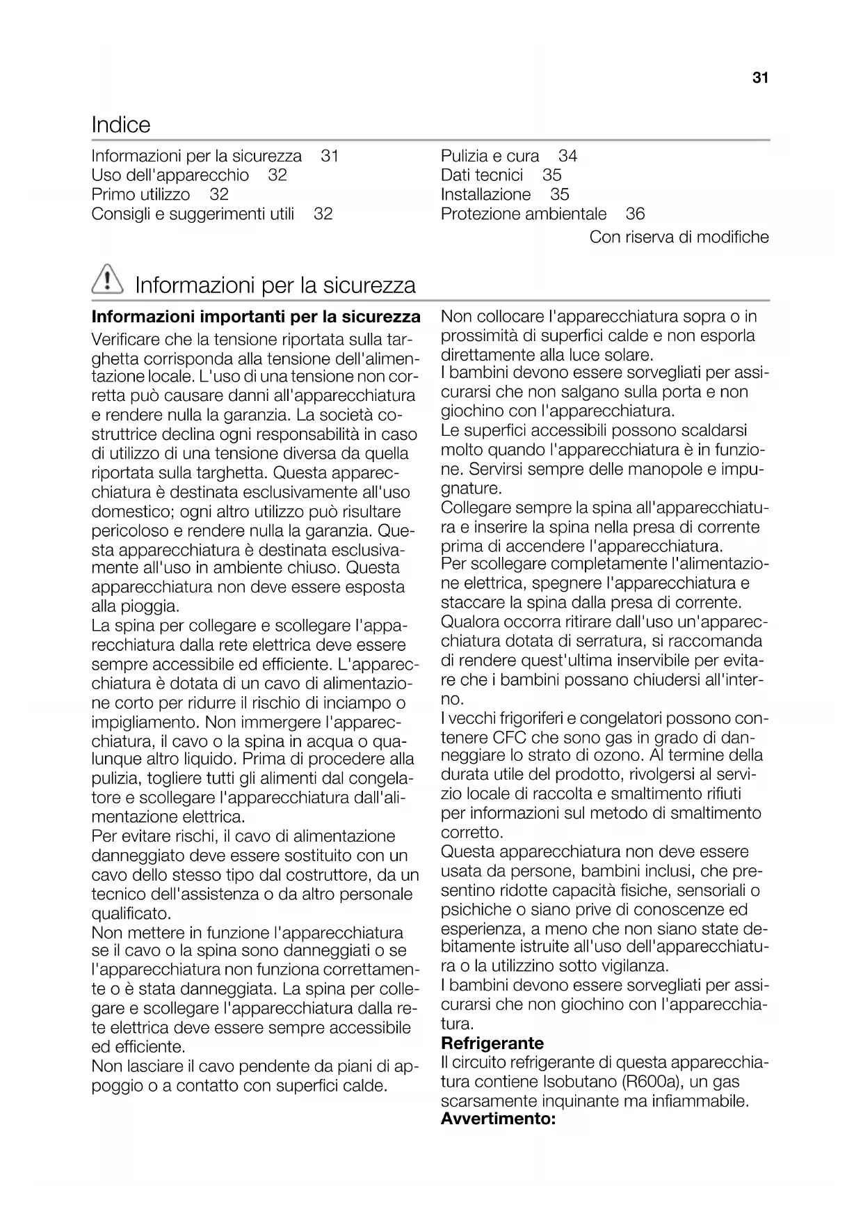 30Indice Informazioni per la sicurezza 31 Uso dell'apparecchio 32 Primo utilizzo 32 Consigli e suggerimenti utili 32 Pulizia e cura 34 Dati tecnici 35 Installazione 35 Protezione ambientale 36 Con riserva di modifiche Informazioni per la sicurezza Informazioni importanti per la sicurezza Verificare che la tensione riportata sulla tar- ghetta corrisponda alla tensione dell'alimen- tazione locale. L'uso di una tensione non cor- retta può causare danni all'apparecchiatura e rendere nulla la garanzia. La società co- struttrice declina ogni responsabilità in caso di utilizzo di una tensione diversa da quella riportata sulla targhetta. Questa apparec- chiatura è destinata esclusivamente all'uso domestico; ogni altro utilizzo può risultare pericoloso e rendere nulla la garanzia. Que- sta apparecchiatura è destinata esclusiva- mente all'uso in ambiente chiuso. Questa apparecchiatura non deve essere esposta alla pioggia. La spina per collegare e scollegare l'appa- recchiatura dalla rete elettrica deve essere sempre accessibile ed efficiente. L'apparec- chiatura è dotata di un cavo di alimentazio- ne corto per ridurre il rischio di inciampo o impigliamento. Non immergere l'apparec- chiatura, il cavo o la spina in acqua o qua- lunque altro liquido. Prima di procedere alla pulizia, togliere tutti gli alimenti dal congela- tore e scollegare l'apparecchiatura dall'ali- mentazione elettrica. Per evitare rischi, il cavo di alimentazione danneggiato deve essere sostituito con un cavo dello stesso tipo dal costruttore, da un tecnico dell'assistenza o da altro personale qualificato. Non mettere in funzione l'apparecchiatura se il cavo o la spina sono danneggiati o se l'apparecchiatura non funziona correttamen- te o è stata danneggiata. La spina per colle- gare e scollegare l'apparecchiatura dalla re- te elettrica deve essere sempre accessibile ed efficiente. Non lasciare il cavo pendente da piani di ap- poggio o a contatto con superfici calde. Non collocare l'apparecchiatura sopra o in prossimità di superfici calde e non esporla direttamente alla luce solare. I bambini devono essere sorvegliati per assi- curarsi che non salgano sulla porta e non giochino con l'apparecchiatura. Le superfici accessibili possono scaldarsi molto quando l'apparecchiatura è in funzio- ne. Servirsi sempre delle manopole e impu- gnature. Collegare sempre la spina all'apparecchiatu- ra e inserire la spina nella presa di corrente prima di accendere l'apparecchiatura. Per scollegare completamente l'alimentazio- ne elettrica, spegnere l'apparecchiatura e staccare la spina dalla presa di corrente. Qualora occorra ritirare dall'uso un'apparec- chiatura dotata di serratura, si raccomanda di rendere quest'ultima inservibile per evita- re che i bambini possano chiudersi all'inter- no. I vecchi frigoriferi e congelatori possono con- tenere CFC che sono gas in grado di dan- neggiare lo strato di ozono. Al termine della durata utile del prodotto, rivolgersi al servi- zio locale di raccolta e smaltimento rifiuti per informazioni sul metodo di smaltimento corretto. Questa apparecchiatura non deve essere usata da persone, bambini inclusi, che pre- sentino ridotte capacità fisiche, sensoriali o psichiche o siano prive di conoscenze ed esperienza, a meno che non siano state de- bitamente istruite all'uso dell'apparecchiatu- ra o la utilizzino sotto vigilanza. I bambini devono essere sorvegliati per assi- curarsi che non giochino con l'apparecchia- tura. Refrigerante Il circuito refrigerante di questa apparecchia- tura contiene Isobutano (R600a), un gas scarsamente inquinante ma infiammabile. Avvertimento: 31Prestare estrema attenzione quando occor- re spostare l'apparecchiatura. Attenzione: Durante il trasporto e l'installazione dell'ap- parecchiatura, prestare estrema attenzione per evitare infortuni. Non danneggiare nes- suna parte del sistema refrigerante. Non utilizzare oggetti appuntiti o taglienti (ad es. coltelli) per sbrinare l'apparecchiatu- ra. Non usare dispositivi elettrici o altri mezzi ar- tificiali non raccomandati dal produttore allo scopo di accelerare il processo di sbrina- mento. Non utilizzare apparecchiature elettriche al- l'interno dei comparti di conservazione degli alimenti, ad eccezione di quelli consigliati dal costruttore. Se l'apparecchiatura è installata su un pavi- mento con moquette, assicurarsi che le aperture previste per la ventilazione nella par- te bassa dell'apparecchiatura non siano ostruite e dopo qualche ora di assestamen- to regolare l'altezza dei piedini. Verificare che le aperture di ventilazione, sia sull'apparecchiatura sia nella struttura da in- casso, siano libere da ostruzioni. Uso dell'apparecchio Accensione Inserire la spina nella presa. Ruotare il regolatore di temperatura in sen- so orario. Spegnimento Per spegnere l'apparecchiatura, ruotare il re- golatore di temperatura in posizione OFF. Regolazione della temperatura La temperatura viene regolata automatica- mente. Per regolare il livello di raffreddamento, pro- cedere come segue: