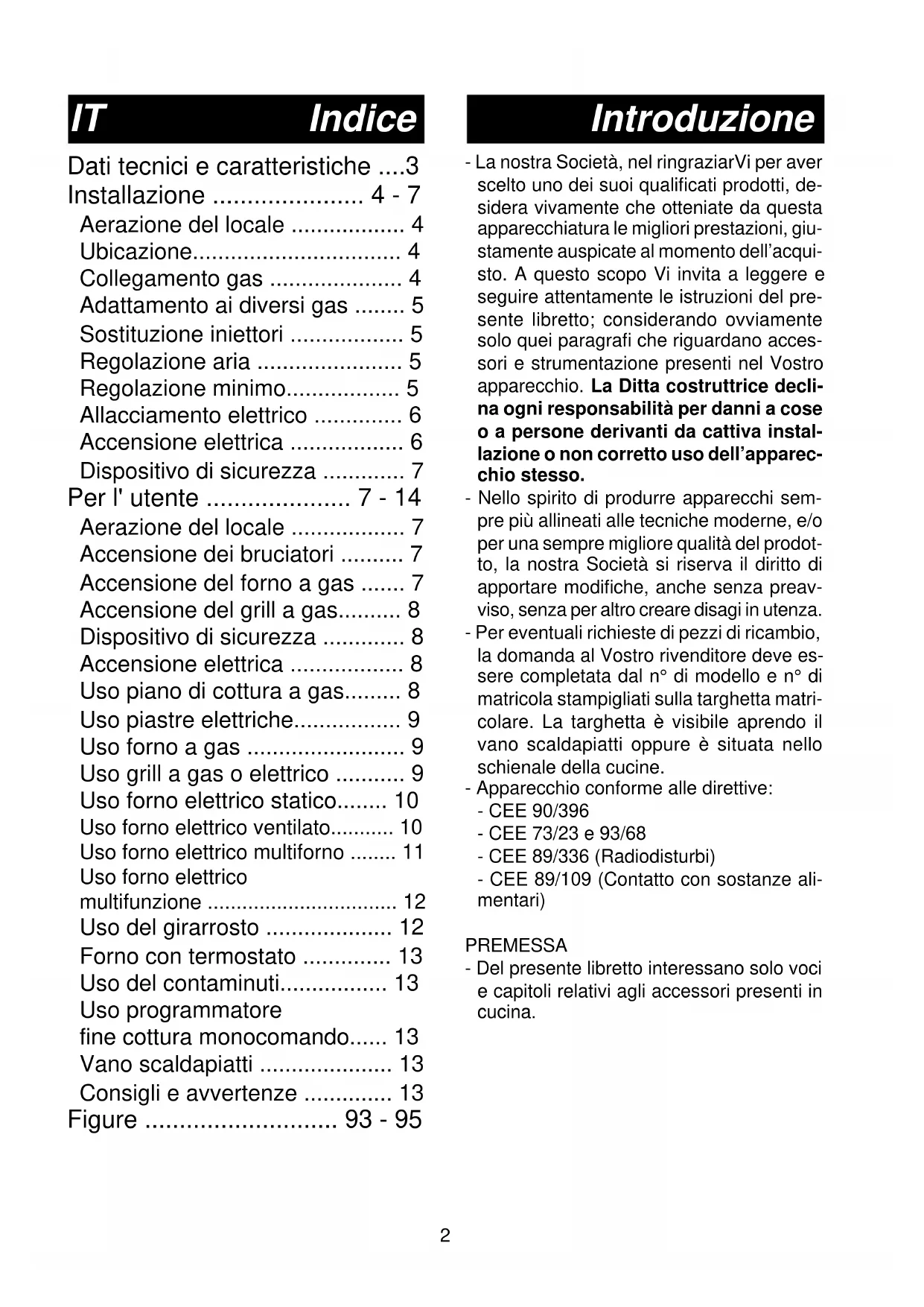 - Libretto istruzioni per l'installazione e l'uso di cucine a gas, miste ed elettriche. Serie: Notice d'installation et d'utilisation des cuisinières à gaz, mixtes et électrique. Séries: Instructions for use and maintenance of gas, gas-electric and electric cookers. Series: Rukovodstvo po ustanovke i `kspluatacii gazovyx,Rukovodstvo po ustanovke i `kspluatacii gazovyx, Rukovodstvo po ustanovke i `kspluatacii gazovyx,Rukovodstvo po ustanovke i `kspluatacii gazovyx, Rukovodstvo po ustanovke i `kspluatacii gazovyx, kombinirovannyx i `lektriheskix plit. Serii%kombinirovannyx i `lektriheskix plit. Serii% kombinirovannyx i `lektriheskix plit. Serii%kombinirovannyx i `lektriheskix plit. Serii% kombinirovannyx i `lektriheskix plit. Serii% Instruções de uso e manutenção de fogões a gás, mistos e eléctricos. Série: √‰ËÁ›Â˜ ÁÈ· ÙË ¯Ú‹ÛË Î·È ÙË Û˘ÓÙ‹ÚËÛË ÎÔ˘˙ÈÓÒÓ ˘ÁÚ·ÂÚ›Ô˘, ËÏÂÎÙÚÈÎÒÓ Î·È ÌÈÎÙÒÓ. ªÔÓ٤Ϸ: Instrucciones de uso y mantenimiento de cocinas de gas, mixtas y eléctricas. Serie:2 Introduzione - La nostra Società, nel ringraziarVi per aver scelto uno dei suoi qualificati prodotti, de- sidera vivamente che otteniate da questa apparecchiatura le migliori prestazioni, giu- stamente auspicate al momento dell’acqui- sto. A questo scopo Vi invita a leggere e seguire attentamente le istruzioni del pre- sente libretto; considerando ovviamente solo quei paragrafi che riguardano acces- sori e strumentazione presenti nel Vostro apparecchio. La Ditta costruttrice decli- na ogni responsabilità per danni a cose o a persone derivanti da cattiva instal- lazione o non corretto uso dell’apparec- chio stesso. - Nello spirito di produrre apparecchi sem- pre più allineati alle tecniche moderne, e/o per una sempre migliore qualità del prodot- to, la nostra Società si riserva il diritto di apportare modifiche, anche senza preav- viso, senza per altro creare disagi in utenza. - Per eventuali richieste di pezzi di ricambio, la domanda al Vostro rivenditore deve es- sere completata dal n° di modello e n° di matricola stampigliati sulla targhetta matri- colare. La targhetta è visibile aprendo il vano scaldapiatti oppure è situata nello schienale della cucine. - Apparecchio conforme alle direttive: - CEE 90/396 - CEE 73/23 e 93/68 - CEE 89/336 (Radiodisturbi) - CEE 89/109 (Contatto con sostanze ali- mentari) PREMESSA - Del presente libretto interessano solo voci e capitoli relativi agli accessori presenti in cucina. Indice Dati tecnici e caratteristiche p. 3