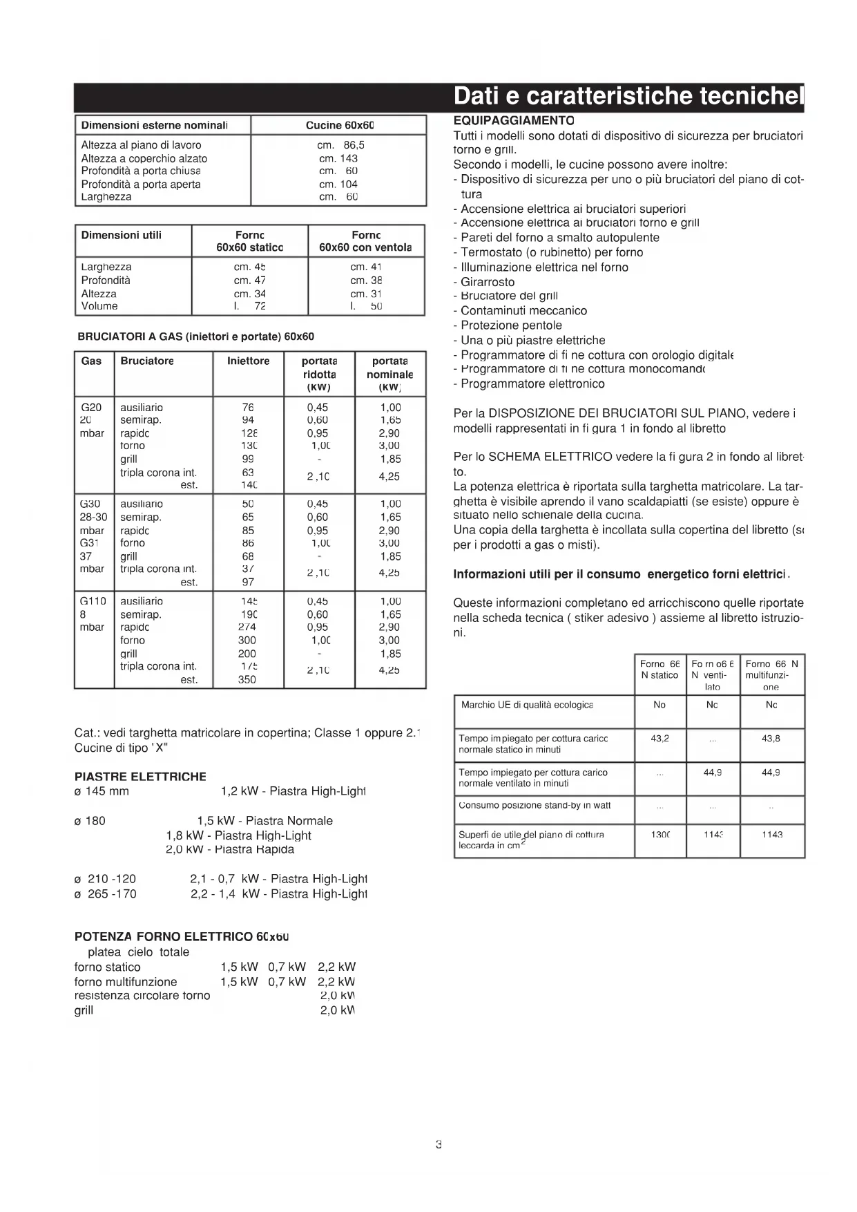 REMESSA - Del presente libretto interessano solo voci e capitoli relativi agli accessori presenti in cucina.3 EQUIPAGGIAMENTO Tutti i modelli sono dotati di dispositivo di sicurezza per bruciatori forno e grill. Secondo i modelli, le cucine possono avere inoltre: - Dispositivo di sicurezza per uno o più bruciatori del piano di cot- tura - Accensione elettrica ai bruciatori superiori - Accensione elettrica ai bruciatori forno e grill - Pareti del forno a smalto autopulente - Termostato (o rubinetto) per forno - Illuminazione elettrica nel forno - Girarrosto - Bruciatore del grill - Contaminuti meccanico - Protezione pentole - Una o più piastre elettriche - Programmatore di fi ne cottura con orologio digitale - Programmatore di fi ne cottura monocomando - Programmatore elettronico Per la DISPOSIZIONE DEI BRUCIATORI SUL PIANO, vedere i modelli rappresentati in fi gura 1 in fondo al libretto. Per lo SCHEMA ELETTRICO vedere la fi gura 2 in fondo al libret- to. La potenza elettrica è riportata sulla targhetta matricolare. La tar- ghetta è visibile aprendo il vano scaldapiatti (se esiste) oppure è situato nello schienale della cucina. Una copia della targhetta è incollata sulla copertina del libretto (solo per i prodotti a gas o misti). Informazioni utili per il consumo energetico forni elettrici