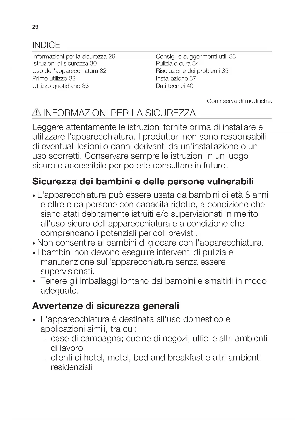 Per ogni prodotto concediamo una garanzia di 2 anni a partire dalla data di consegna o dalla sua messa in funzione. (Fa stato la data della fattura, del certificato di garanzia o dello scontrino d’acquisto) Nella garanzia sono comprese le spese di manodopera, di viaggio e del materiale. Dalla copertura sono esclusi il logoramento ed i danni causati da agenti esterni, intervento di terzi, utilizzo di ricambi non originali o dalla inosservanza delle prescrizioni d’istallazione ed istruzioni per l’uso. CONSIDERAZIONI SULL'AMBIENTE Riciclare i materiali con il simbolo . Buttare l'imballaggio negli appositi contenitori per il riciclaggio. Aiutare a proteggere l’ambiente e la salute umana e a riciclare rifiuti derivanti da apparecchiature elettriche ed elettroniche. Non smaltire le apparecchiature che riportano il simbolo insieme ai normali rifiuti domestici. Portare il prodotto al punto di riciclaggio più vicino o contattare il comune di residenza. Per la Svizzera: Dove portare gli apparecchi fuori uso? In qualsiasi negozio che vende apparecchi nuovi oppure si restituiscono ai centri di raccolta ufficiali della SENS oppure ai riciclatori ufficiali della SENS. La lista dei centri di raccolta ufficiali della SENS è visibile nel sito www.erecycling.ch 41CONTENTS Safety information 42 Safety instructions 43 Operation 45 First use 45 Daily use 45 Hints and tips 46 Care and cleaning 47 Troubleshooting 48 Installation 50 Technical data 52 Subject to change without notice. SAFETY INFORMATION Before the installation and use of the appliance, carefully read the supplied instructions. The manufacturer is not responsible for any injuries or damages that are the result of incorrect installation or usage. Always keep the instructions in a safe and accessible location for future reference. Children and vulnerable people safety