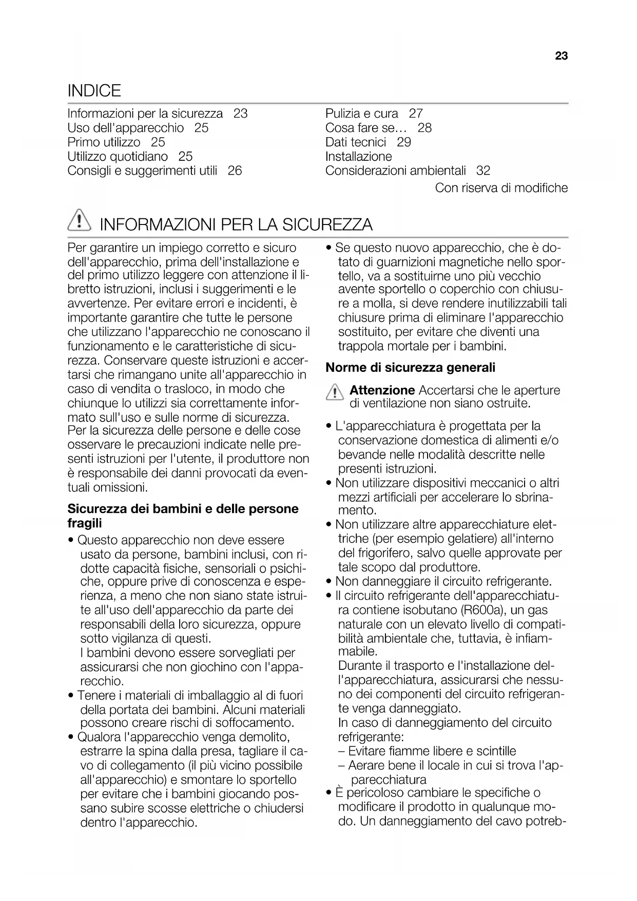22INDICE Informazioni per la sicurezza 23 Uso dell'apparecchio 25 Primo utilizzo 25 Utilizzo quotidiano 25 Consigli e suggerimenti utili 26 Pulizia e cura 27 Cosa fare se… 28 Dati tecnici 29 Installazione 30 Considerazioni ambientali 32 Con riserva di modifiche