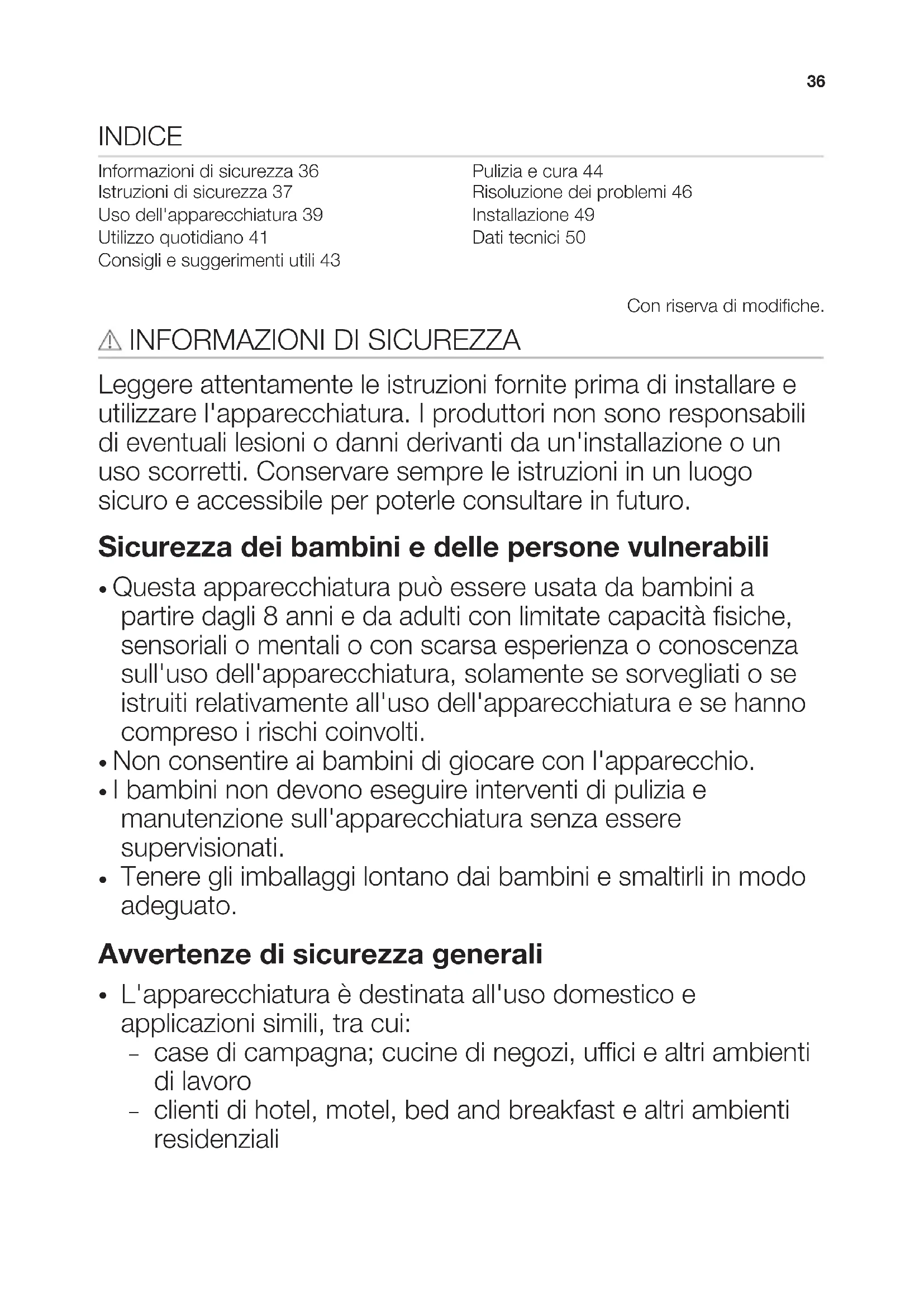 Per ogni prodotto concediamo una garanzia di 2 anni a partire dalla data di consegna o dalla sua messa in funzione. (Fa stato la data della fattura, del certificato di garanzia o dello scontrino d’acquisto) Nella garanzia sono comprese le spese di manodopera, di viaggio e del materiale. Dalla copertura sono esclusi il logoramento ed i danni causati da agenti esterni, intervento di terzi, utilizzo di ricambi non originali o dalla inosservanza delle prescrizioni d’istallazione ed istruzioni per l’uso. EN MATIÈRE DE PROTECTION DE L'ENVIRONNEMENT Recyclez les matériaux portant le symbole . Déposez les emballages dans les conteneurs prévus à cet effet. Contribuez à la protection de l'environnement et à votre sécurité, recyclez vos produits électriques et électroniques. Ne jetez pas les appareils portant le symbole avec les ordures ménagères. Emmenez un tel produit dans votre centre local de recyclage ou contactez vos services municipaux. Pour la Suisse: Où aller avec les appareils usagés ? Partout où des appareils neufs sont vendus, mais aussi dans un centre de collecte ou une entreprise de récupération officiels SENS. La liste des centres de collecte officiels SENS est disponible sous www.erecycling.ch 35INDICE Informazioni di sicurezza 36 Istruzioni di sicurezza 37 Uso dell'apparecchiatura 39 Utilizzo quotidiano 41 Consigli e suggerimenti utili 43 Pulizia e cura 44 Risoluzione dei problemi 46 Installazione 49 Dati tecnici 50 Con riserva di modifiche.