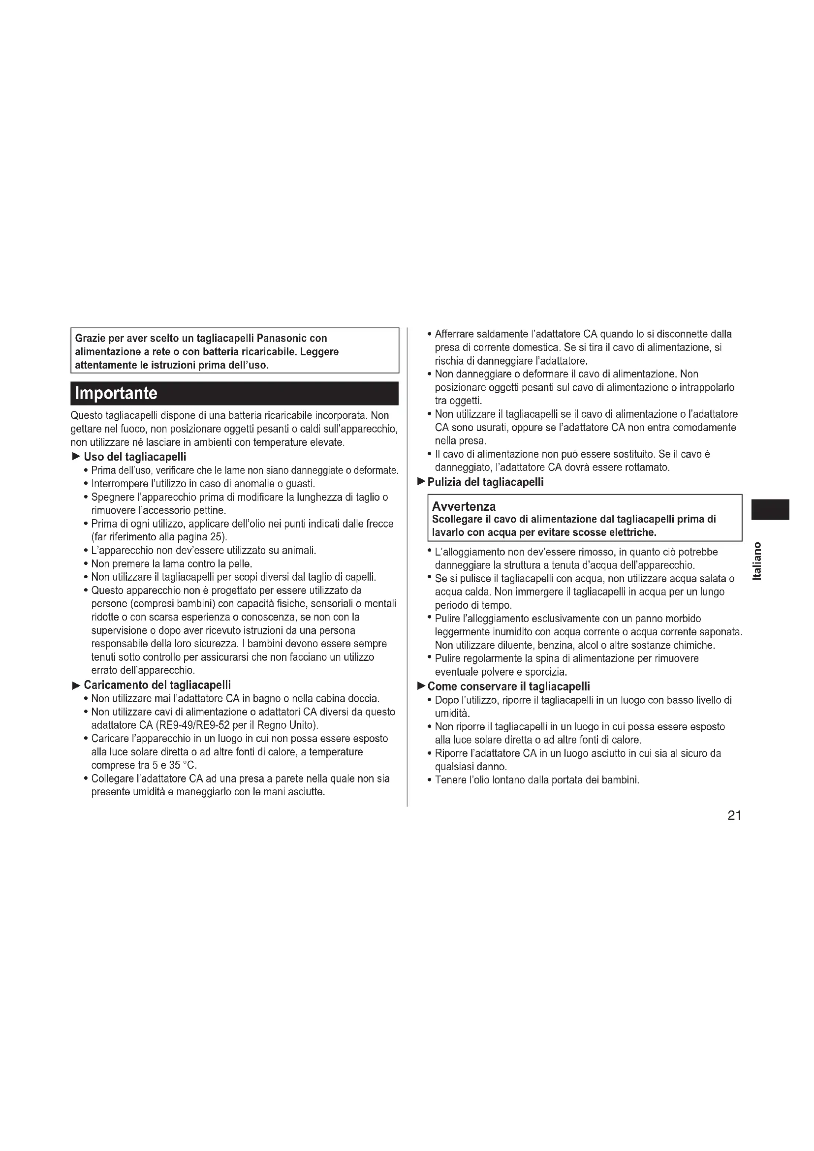 Grazie per aver scelto un tagliacapelli Panasonic con alimentazione a rete o con batteria ricaricabile. Leggere attentamente le istruzioni prima dell’uso. Importante Questo tagliacapelli dispone di una batteria ricaricabile incorporata. Non gettare nel fuoco, non posizionare oggetti pesanti o caldi sull’apparecchio, non utilizzare né lasciare in ambienti con temperature elevate. Uso del tagliacapelli Prima dell’uso, vericare che le lame non siano danneggiate o deformate. Interrompere l’utilizzo in caso di anomalie o guasti. Spegnere l’apparecchio prima di modicare la lunghezza di taglio o rimuovere l’accessorio pettine. Prima di ogni utilizzo, applicare dell’olio nei punti indicati dalle frecce (far riferimento alla pagina 25). L’apparecchio non dev’essere utilizzato su animali. Non premere la lama contro la pelle. Non utilizzare il tagliacapelli per scopi diversi dal taglio di capelli. Questo apparecchio non è progettato per essere utilizzato da persone (compresi bambini) con capacità siche, sensoriali o mentali ridotte o con scarsa esperienza o conoscenza, se non con la supervisione o dopo aver ricevuto istruzioni da una persona responsabile della loro sicurezza. I bambini devono essere sempre tenuti sotto controllo per assicurarsi che non facciano un utilizzo errato dell’apparecchio. Caricamento del tagliacapelli Non utilizzare mai l’adattatore CA in bagno o nella cabina doccia. Non utilizzare cavi di alimentazione o adattatori CA diversi da questo adattatore CA (RE9‑49/RE9‑52 per il Regno Unito). Caricare l’apparecchio in un luogo in cui non possa essere esposto alla luce solare diretta o ad altre fonti di calore, a temperature comprese tra 5 e 35 °C. Collegare l’adattatore CA ad una presa a parete nella quale non sia presente umidità e maneggiarlo con le mani asciutte.