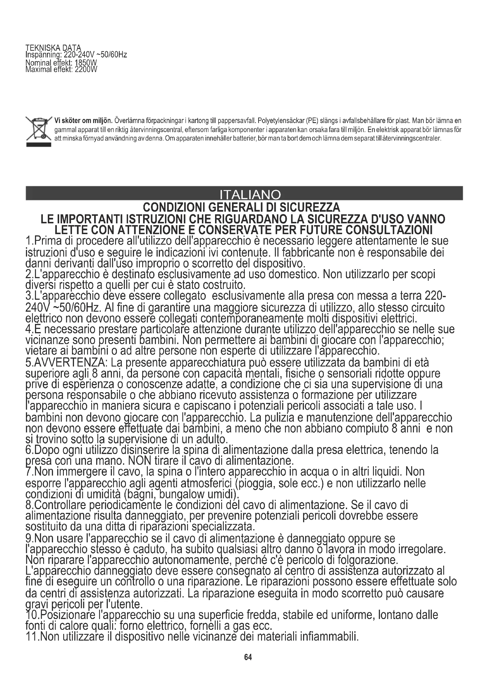 LE IMPORTANTI ISTRUZIONI CHE RIGUARDANO LA SICUREZZA D'USO VANNO LETTE CON ATTENZIONE E CONSERVATE PER FUTURE CONSULTAZIONI 1.Prima di procedere all'utilizzo dell'apparecchio è necessario leggere attentamente le sue istruzioni d'uso e seguire le indicazioni ivi contenute. Il fabbricante non è responsabile dei danni derivanti dall'uso improprio o scorretto del dispositivo. 2.L'apparecchio è destinato esclusivamente ad uso domestico. Non utilizzarlo per scopi diversi rispetto a quelli per cui è stato costruito. 3.L'apparecchio deve essere collegato esclusivamente alla presa con messa a terra 220- 240V ~50/60Hz. Al fine di garantire una maggiore sicurezza di utilizzo, allo stesso circuito elettrico non devono essere collegati contemporaneamente molti dispositivi elettrici. 4.È necessario prestare particolare attenzione durante utilizzo dell'apparecchio se nelle sue vicinanze sono presenti bambini. Non permettere ai bambini di giocare con l'apparecchio; vietare ai bambini o ad altre persone non esperte di utilizzare l'apparecchio. 5.AVVERTENZA: La presente apparecchiatura può essere utilizzata da bambini di età superiore agli 8 anni, da persone con capacità mentali, fisiche o sensoriali ridotte oppure prive di esperienza o conoscenze adatte, a condizione che ci sia una supervisione di una persona responsabile o che abbiano ricevuto assistenza o formazione per utilizzare l'apparecchio in maniera sicura e capiscano i potenziali pericoli associati a tale uso. I bambini non devono giocare con l'apparecchio. La pulizia e manutenzione dell'apparecchio non devono essere effettuate dai bambini, a meno che non abbiano compiuto 8 anni e non si trovino sotto la supervisione di un adulto. 6.Dopo ogni utilizzo disinserire la spina di alimentazione dalla presa elettrica, tenendo la presa con una mano. NON tirare il cavo di alimentazione. 7.Non immergere il cavo, la spina o l'intero apparecchio in acqua o in altri liquidi. Non esporre l'apparecchio agli agenti atmosferici (pioggia, sole ecc.) e non utilizzarlo nelle condizioni di umidità (bagni, bungalow umidi). 8.Controllare periodicamente le condizioni del cavo di alimentazione. Se il cavo di alimentazione risulta danneggiato, per prevenire potenziali pericoli dovrebbe essere sostituito da una ditta di riparazioni specializzata. 9.Non usare l'apparecchio se il cavo di alimentazione è danneggiato oppure se l'apparecchio stesso è caduto, ha subito qualsiasi altro danno o lavora in modo irregolare. Non riparare l'apparecchio autonomamente, perché c'è pericolo di folgorazione. L'apparecchio danneggiato deve essere consegnato al centro di assistenza autorizzato al fine di eseguire un controllo o una riparazione. Le riparazioni possono essere effettuate solo da centri di assistenza autorizzati. La riparazione eseguita in modo scorretto può causare gravi pericoli per l'utente. 10.Posizionare l'apparecchio su una superficie fredda, stabile ed uniforme, lontano dalle fonti di calore quali: forno elettrico, fornelli a gas ecc. 11.Non utilizzare il dispositivo nelle vicinanze dei materiali infiammabili. TEKNISKA DATA Inspänning: 220-240V ~50/60Hz Nominal effekt: 1850W Maximal effekt: 2200W 6412.Non lasciare pendere il cavo dagli angoli del tavolo e non toccare superfici calde. 13.Non è consentito lasciare l'apparecchio o il caricabatterie con il cavo inserito nella spina senza vigilanza. 14.Per garantire una protezione supplementare è raccomandato installare nel circuito elettrico un dispositivo RCD con corrente differenziale nominale non superiore a 30 mA. Per questo è necessario rivolgersi al personale elettrico specializzato.
