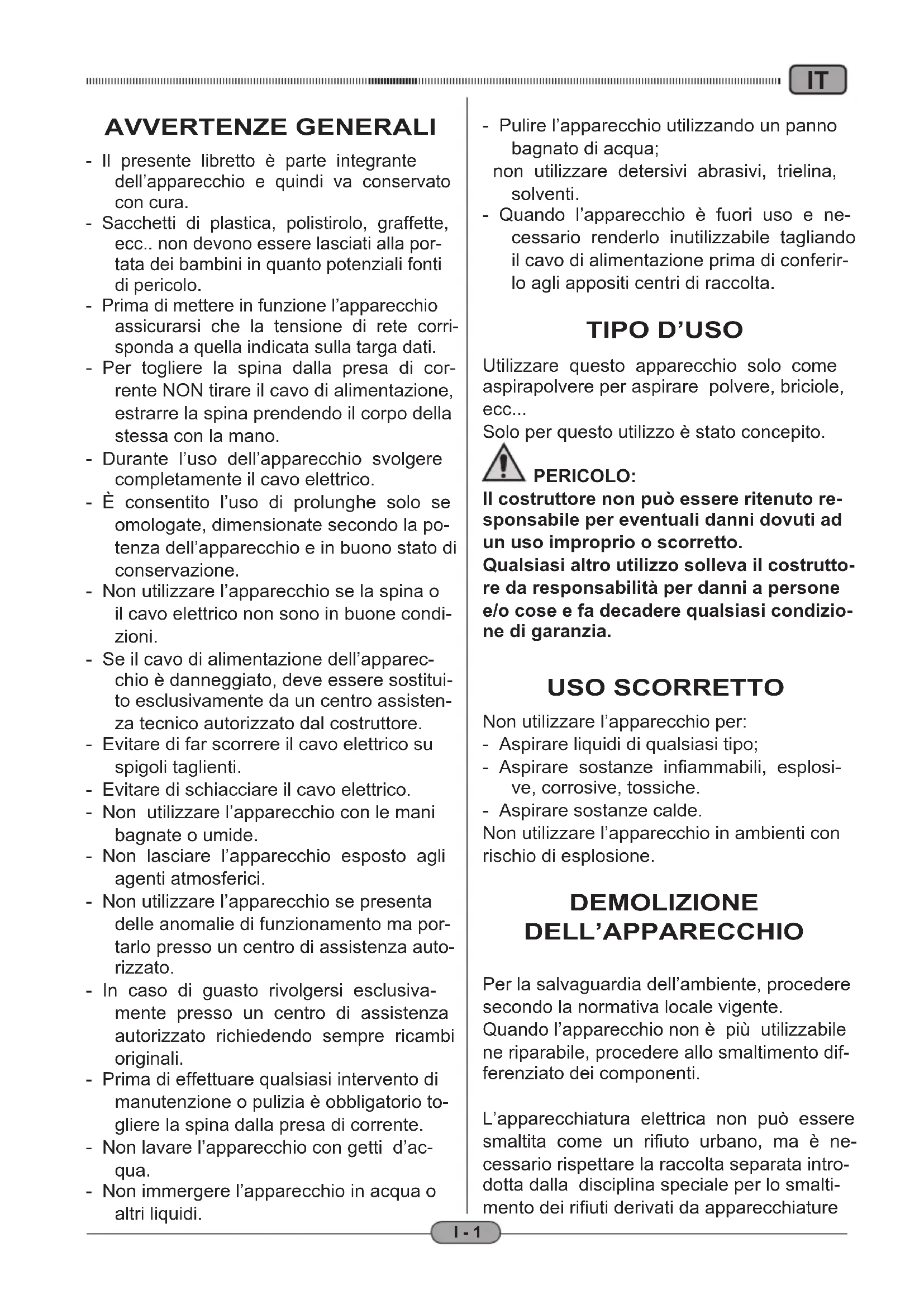 Il costruttore non può essere ritenuto responsablee per eventuali danni dovuti ad un uso improprio o scorretto.