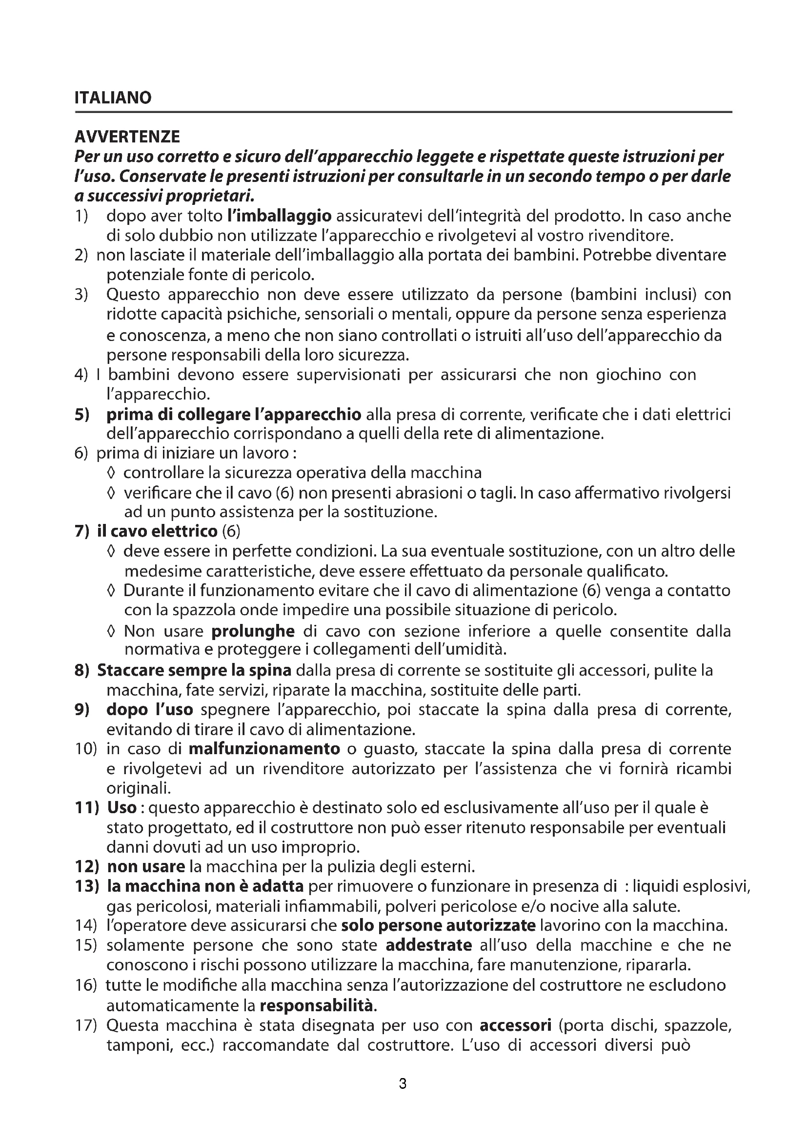 17) Questa macchina è stata disegnata per uso con accessori (porta dischi, spazzole, tamponi, ecc.) raccomandate dal costruttore. L'uso di accessori diversi cui