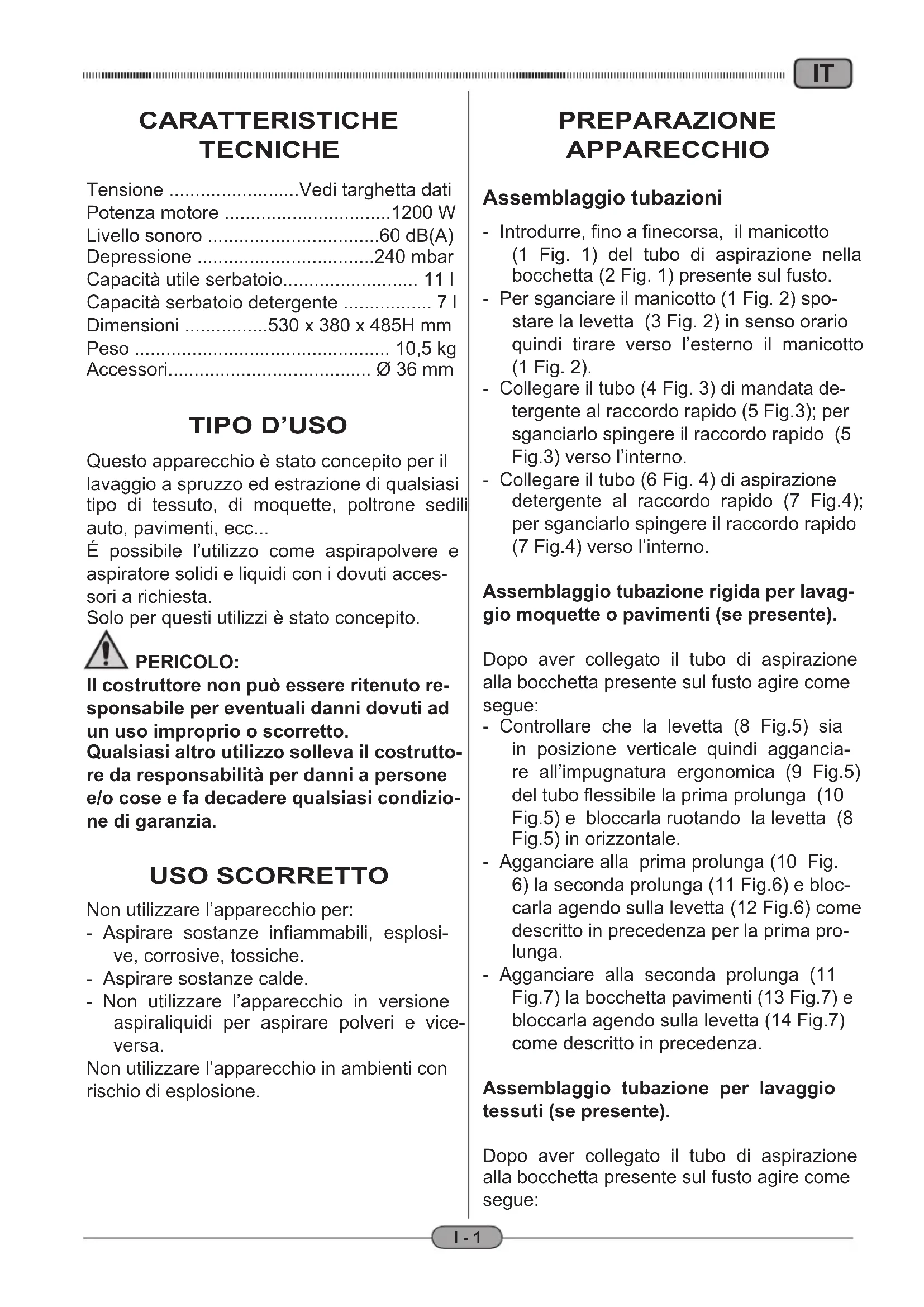 Questo apparecchio è stato concepito per il lavaggio a spruzzo ed estrazione di qualsiasi tipo di tessuto, di moquette, poltrone sedili auto, pavimenti, ecc... É possibile l’utilizzo come aspirapolvere e aspiratore solidi e liquidi con i dovuti acces- sori a richiesta. Solo per questi utilizzi è stato concepito. PERICOLO: Il costruttore non può essere ritenuto re- sponsabile per eventuali danni dovuti ad un uso improprio o scorretto. Qualsiasi altro utilizzo solleva il costrutto- re da responsabilità per danni a persone e/o cose e fa decadere qualsiasi condizio- ne di garanzia. USO SCORRETTO Non utilizzare l’apparecchio per: - Aspirare sostanze infiammabili, esplosi- ve, corrosive, tossiche. - Aspirare sostanze calde. - Non utilizzare l’apparecchio in versione aspiraliquidi per aspirare polveri e vice- versa. Non utilizzare l’apparecchio in ambienti con rischio di esplosione. PREPARAZIONE APPARECCHIO Assemblaggio tubazioni - Introdurre, fino a finecorsa, il manicotto (1 Fig. 1) del tubo di aspirazione nella bocchetta (2 Fig. 1) presente sul fusto. - Per sganciare il manicotto (1 Fig. 2) spo- stare la levetta (3 Fig. 2) in senso orario quindi tirare verso l’esterno il manicotto (1 Fig. 2). - Collegare il tubo (4 Fig. 3) di mandata de- tergente al raccordo rapido (5 Fig.3); per sganciarlo spingere il raccordo rapido (5 Fig.3) verso l’interno. - Collegare il tubo (6 Fig. 4) di aspirazione detergente al raccordo rapido (7 Fig.4); per sganciarlo spingere il raccordo rapido (7 Fig.4) verso l’interno. Assemblaggio tubazione rigida per lavag- gio moquette o pavimenti (se presente). Dopo aver collegato il tubo di aspirazione alla bocchetta presente sul fusto agire come segue: - Controllare che la levetta (8 Fig.5) sia in posizione verticale quindi aggancia- re all’impugnatura ergonomica (9 Fig.5) del tubo flessibile la prima prolunga (10 Fig.5) e bloccarla ruotando la levetta (8 Fig.5) in orizzontale. - Agganciare alla prima prolunga (10 Fig.