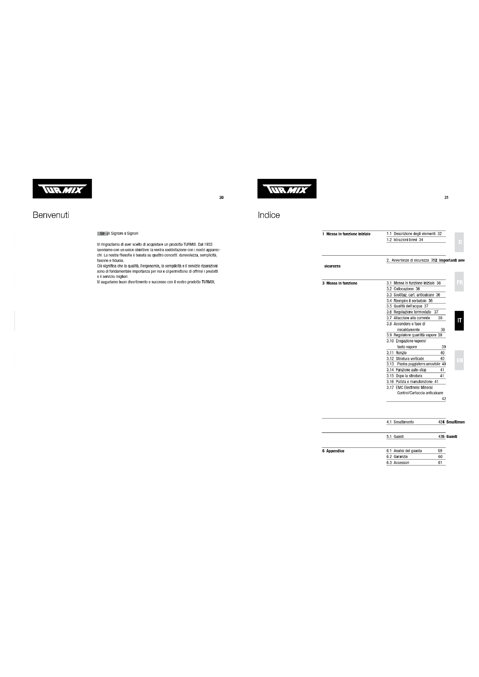 Vi rigraziamo di aver scegli di acquisitare un prodotto TURIMIX. Dal 1933 lavorismo con un unico obletto: la vostra soddisfazione con i nosti apparecch. La mia filosofia è basata su quattro concetti: durevolezza, semplicità, fascino e fiducia.