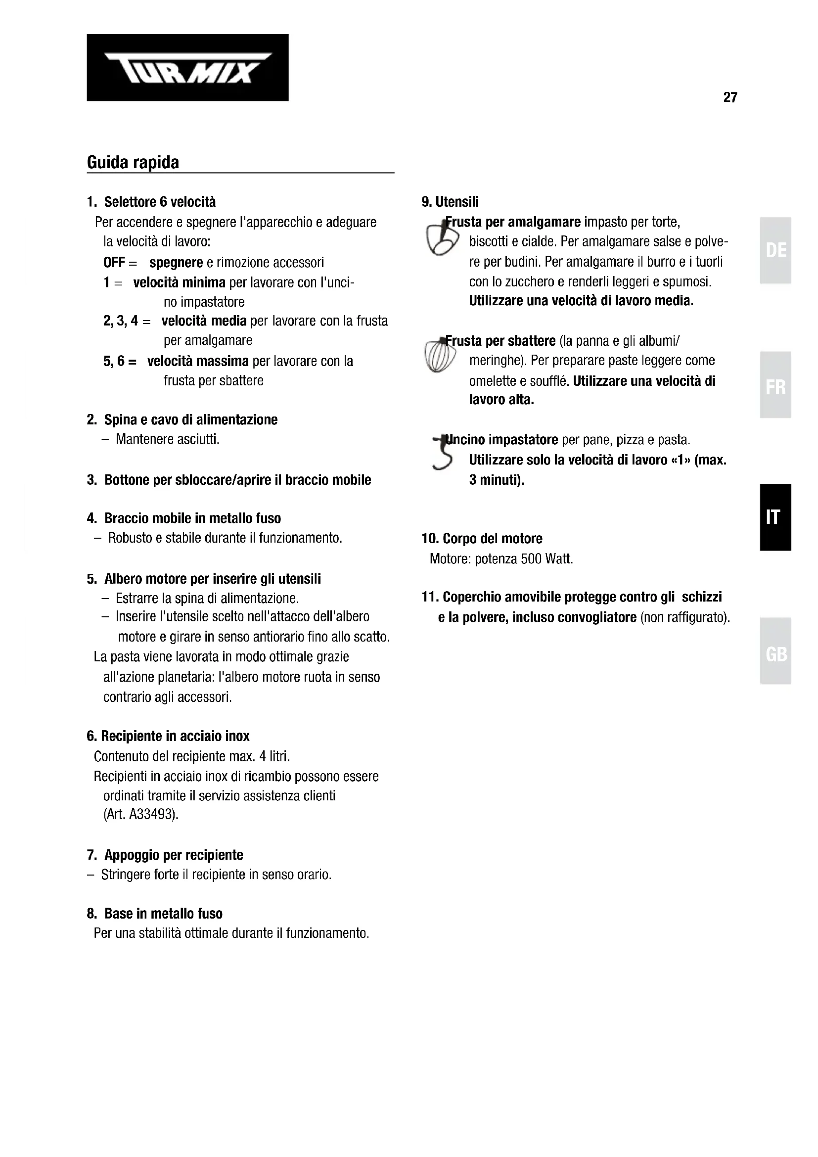Garanzia Sui suoi elettrodomestici TURMIX concede una garanzia per i 2 anni successivi alla data d'acquisto. Ci prendiamo a carico la sostituzione gratuita dei pezzi dell'apparecchio che durante il periodo di garanzia hanno subito danni conseguenti a difetti di fabbrica o di materiali. L'invio dell'apparecchio deve essere effettuato nell'imballaggio originale o di pari efficienza. La garanzia decade in caso di uso improprio dell'apparecchio o se vengono effettuate riparazioni da terzi non autorizzati. Non sono coperti dalla garanzia danni dovuti ad effetti idro-chimici (es. depositi calcarei) o alla normale usura dell'apparec- chio. Inoltre sono esclusi dalla garanzia danni dovuti all'utilizzo di acqua proveniente da impianti di decalcificazione. Conservare lo scontrino d'acquisto valevole come prova di garanzia.