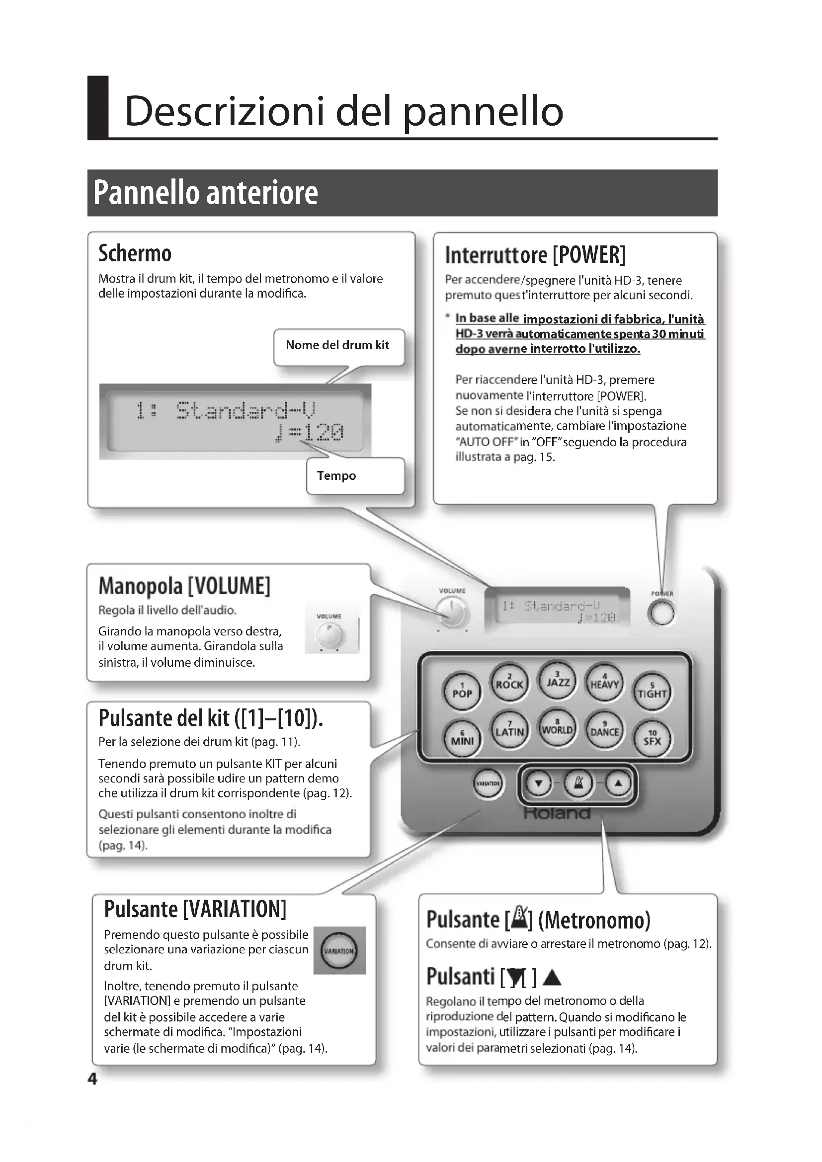 - 5 1 0 0 0 2 3 4 9 2 - 0 2 *Deutsch Français Italiano Español Português NederlandsEnglishFunzioni principali Una vasta gamma di sonorità L'unità HD-3 include 20 diversi drum kit, progettati per l'utilizzo con tutti gli stili di musica. Riferimenti “Elenco delle sonorità del drum kit” (pag. 17) Il piacere di suonare in cua Le cue consentono di suonare senza che nessun altro ascolti. A dierenza delle batterie acustiche, non viene prodotto alcun suono, quindi non si corre il rischio di disturbare nessuno. L'ingresso MIX IN consente di collegare fonti audio esterne ed è l'ideale per suonare con lettori audio e simili. Una batteria compatta L'unità HD-3 è un sistema compatto, semplice e facile da congurare praticamente ovunque. Per suonare dovunque si desideri È suciente accendere l'unità HD-3, selezionare un drum kit, e l'unità è pronta a suonare. Prima di utilizzare questa unità, leggere attentamente le sezioni intitolate “UTILIZZO SICURO DELL'UNITÀ” e “NOTE IMPORTANTI” (l'ultima pagina della Guida all'installazione). che contengono importanti informazioni sul corretto impiego dell'unità. Inoltre, per essere sicuri di aver acquisito una buona conoscenza di tutte le funzioni oerte dalla nuova unità, è necessario leggere per intero la Guida all'installazione e il Manuale dell'utente. Conservare il manuale e tenerlo a portata di mano per usarlo come riferimento. Copyright © 2011 ROLAND CORPORATION Tutti i diritti riservati. Nessuna parte di questo documento può essere in alcun modo riprodotta senza autorizzazione scritta di ROLAND CORPORATION. Roland, V-Drums e V-Drums Lite sono marchi registrati di Roland Corporation negli Stati Uniti e/o in altri Paesi.3 Deutsch Français Italiano Español Português NederlandsEnglish Sommario Funzioni principali . . . . . . . . . . . . . . . . . . . . . . . . . . . . . . . . . . . . . . . . . . . . . . . . . . . . . . . . 2 Descrizioni del pannello . . . . . . . . . . . . . . . . . . . . . . . . . . . . . . . . . . . . . . . . . . . . . . . . . . . .4 Pannello anteriore . . . . . . . . . . . . . . . . . . . . . . . . . . . . . . . . . . . . . . . . . . . . . . . . . . . . . . . . . 4 Pannello laterale . . . . . . . . . . . . . . . . . . . . . . . . . . . . . . . . . . . . . . . . . . . . . . . . . . . . . . . . . . 5 Introduzione alle percussioni . . . . . . . . . . . . . . . . . . . . . . . . . . . . . . . . . . . . . . . . . . . . . . .6 Elementi della batteria . . . . . . . . . . . . . . . . . . . . . . . . . . . . . . . . . . . . . . . . . . . . . . . . . . . . 6 Informazioni di base per suonare la batteria . . . . . . . . . . . . . . . . . . . . . . . . . . . . . . . . 8 Come leggere le partiture per batteria . . . . . . . . . . . . . . . . . . . . . . . . . . . . . . . . . . . . 10 Suonare la batteria . . . . . . . . . . . . . . . . . . . . . . . . . . . . . . . . . . . . . . . . . . . . . . . . . . . . . . . .11 Accensione e spegnimento dell'unità . . . . . . . . . . . . . . . . . . . . . . . . . . . . . . . . . . . . . 11 Selezione di un drum kit . . . . . . . . . . . . . . . . . . . . . . . . . . . . . . . . . . . . . . . . . . . . . . . . . . 11 Ascolto dei pattern . . . . . . . . . . . . . . . . . . . . . . . . . . . . . . . . . . . . . . . . . . . . . . . . . . . . . . . 12 Suonare con il metronomo . . . . . . . . . . . . . . . . . . . . . . . . . . . . . . . . . . . . . . . . . . . . . . . 12 Impostazioni varie (le schermate di modica) . . . . . . . . . . . . . . . . . . . . . . . . . . . . . . .14 Operazioni di base nelle schermate di modica . . . . . . . . . . . . . . . . . . . . . . . . . . . 14 Elenco dei parametri . . . . . . . . . . . . . . . . . . . . . . . . . . . . . . . . . . . . . . . . . . . . . . . . . . . . . 15 Cambia il suono del metronomo . . . . . . . . . . . . . . . . . . . . . . . . . . . . . . . . . . . . 15 Regola il volume del metronomo . . . . . . . . . . . . . . . . . . . . . . . . . . . . . . . . . . . 15 Regola il contrasto dello schermo. . . . . . . . . . . . . . . . . . . . . . . . . . . . . . . . . . . 15 Spegne automaticamente l'unità HD-3 . . . . . . . . . . . . . . . . . . . . . . . . . . . . . . 15 Passa alle impostazioni dei pad per i mancini . . . . . . . . . . . . . . . . . . . . . . . . 15 Regola la sensibilità dei pad . . . . . . . . . . . . . . . . . . . . . . . . . . . . . . . . . . . . . . . . 16 Modica il numero di nota del pad. . . . . . . . . . . . . . . . . . . . . . . . . . . . . . . . . . 16 Imposta il numero di nota per il cross stick . . . . . . . . . . . . . . . . . . . . . . . . . . 16 Ripristina le impostazioni di fabbrica . . . . . . . . . . . . . . . . . . . . . . . . . . . . . . . . 16 Appendice . . . . . . . . . . . . . . . . . . . . . . . . . . . . . . . . . . . . . . . . . . . . . . . . . . . . . . . . . . . . . . . .17 Elenco delle sonorità del drum kit. . . . . . . . . . . . . . . . . . . . . . . . . . . . . . . . . . . . . . . . . 17 Informazioni su MIDI . . . . . . . . . . . . . . . . . . . . . . . . . . . . . . . . . . . . . . . . . . . . . . . . . . . . . 18 Risoluzione dei problemi . . . . . . . . . . . . . . . . . . . . . . . . . . . . . . . . . . . . . . . . . . . . . . . . . 20 Impostazione dell'unità HD-3 per mancini . . . . . . . . . . . . . . . . . . . . . . . . . . . . . . . . 21 Speciche principali . . . . . . . . . . . . . . . . . . . . . . . . . . . . . . . . . . . . . . . . . . . . . . . . . . . . . .224 Pannello anteriore Descrizioni del pannello Pulsante [ ] (Metronomo) Consente di avviare o arrestare il metronomo (pag. 12). Pulsanti [ ] [ ] Regolano il tempo del metronomo o della riproduzione del pattern. Quando si modicano le impostazioni, utilizzare i pulsanti per modicare i valori dei parametri selezionati (pag. 14). Pulsante del kit ([1]–[10]). Per la selezione dei drum kit (pag. 11). Tenendo premuto un pulsante KIT per alcuni secondi sarà possibile udire un pattern demo che utilizza il drum kit corrispondente (pag. 12). 