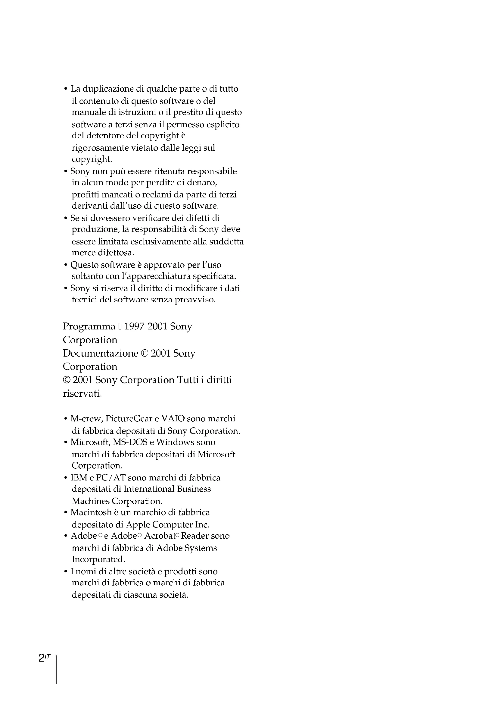 - Sony si riserva il diritto di modificare i dati tecnici del software senza preavviso. Programma 1997-2001 Sony Corporation Documentazione © 2001 Sony Corporation © 2001 Sony Corporation Tutti i diritti riservati.