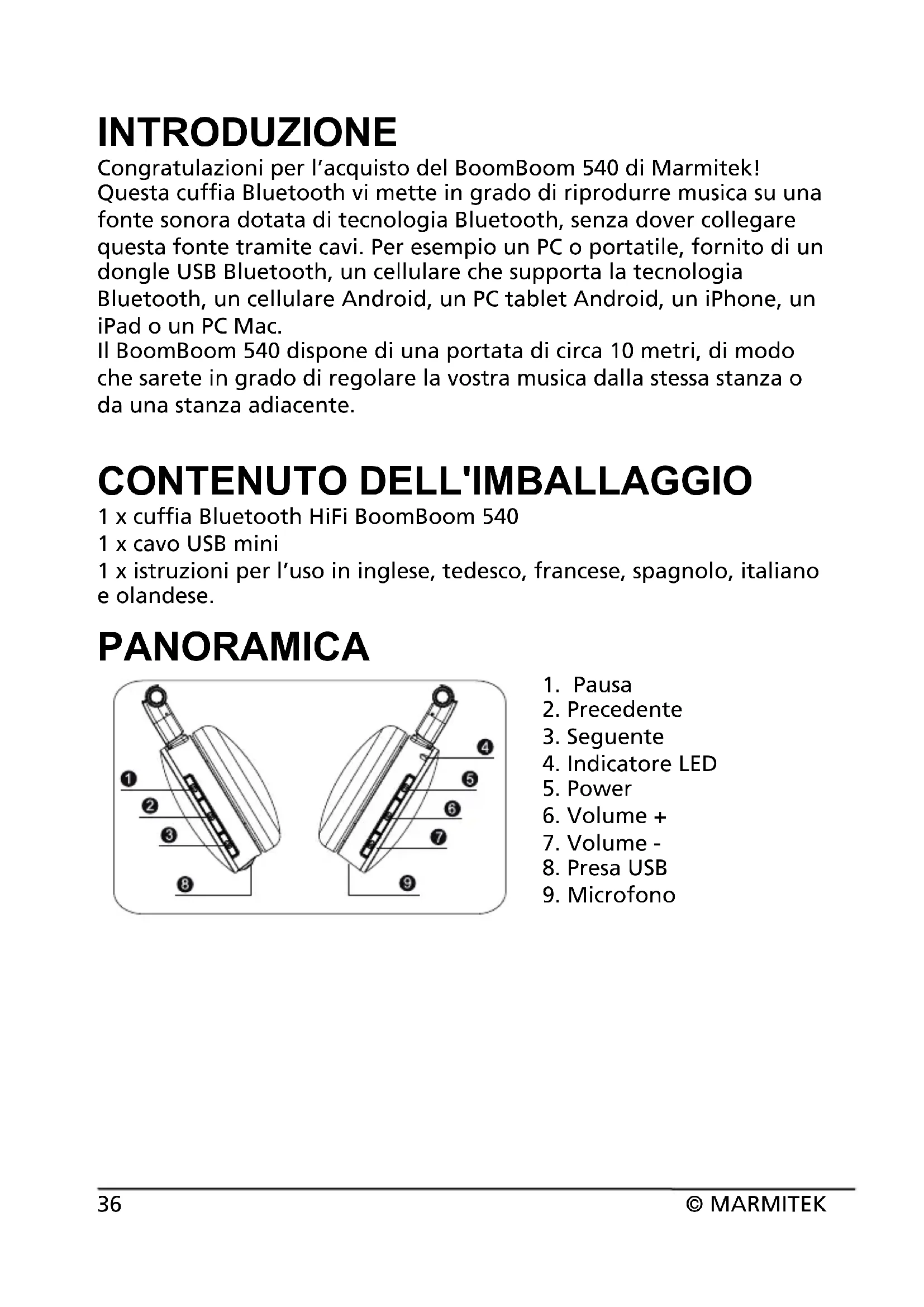 Congratulazioni per l’acquisto del BoomBoom 540 di Marmitek! Questa cuffia Bluetooth vi mette in grado di riprodurre musica su una fonte sonora dotata di tecnologia Bluetooth, senza dover collegare questa fonte tramite cavi. Per esempio un PC o portatile, fornito di un dongle USB Bluetooth, un cellulare che supporta la tecnologia Bluetooth, un cellulare Android, un PC tablet Android, un iPhone, un iPad o un PC Mac. Il BoomBoom 540 dispone di una portata di circa 10 metri, di modo che sarete in grado di regolare la vostra musica dalla stessa stanza o da una stanza adiacente. CONTENUTO DELL'IMBALLAGGIO 1 x cuffia Bluetooth HiFi BoomBoom 540 1 x cavo USB mini 1 x istruzioni per l’uso in inglese, tedesco, francese, spagnolo, italiano e olandese. PANORAMICA