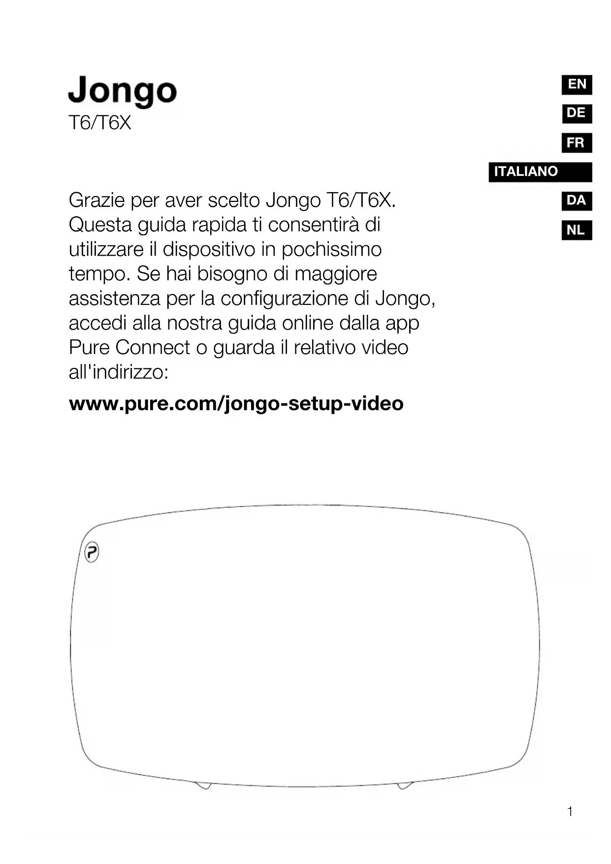Grazie per aver scelto Jongo T6/T6X. Questa guida rapida ti consentirà di utilizzare il dispositivo in pochissimo tempo. Se hai bisogno di maggiore assistenza per la configurazione di Jongo, accedi alla nostra guida online dalla app Pure Connect o guarda il relativo video all'indirizzo: www.pure.com/jongo-setup-video T6/T6X Jongo_T6X_QSG-Euro-v2.indb 1 9/16/2014 1:55:47 PM2 Jongo T6/T6X - Istruzioni di sicurezza