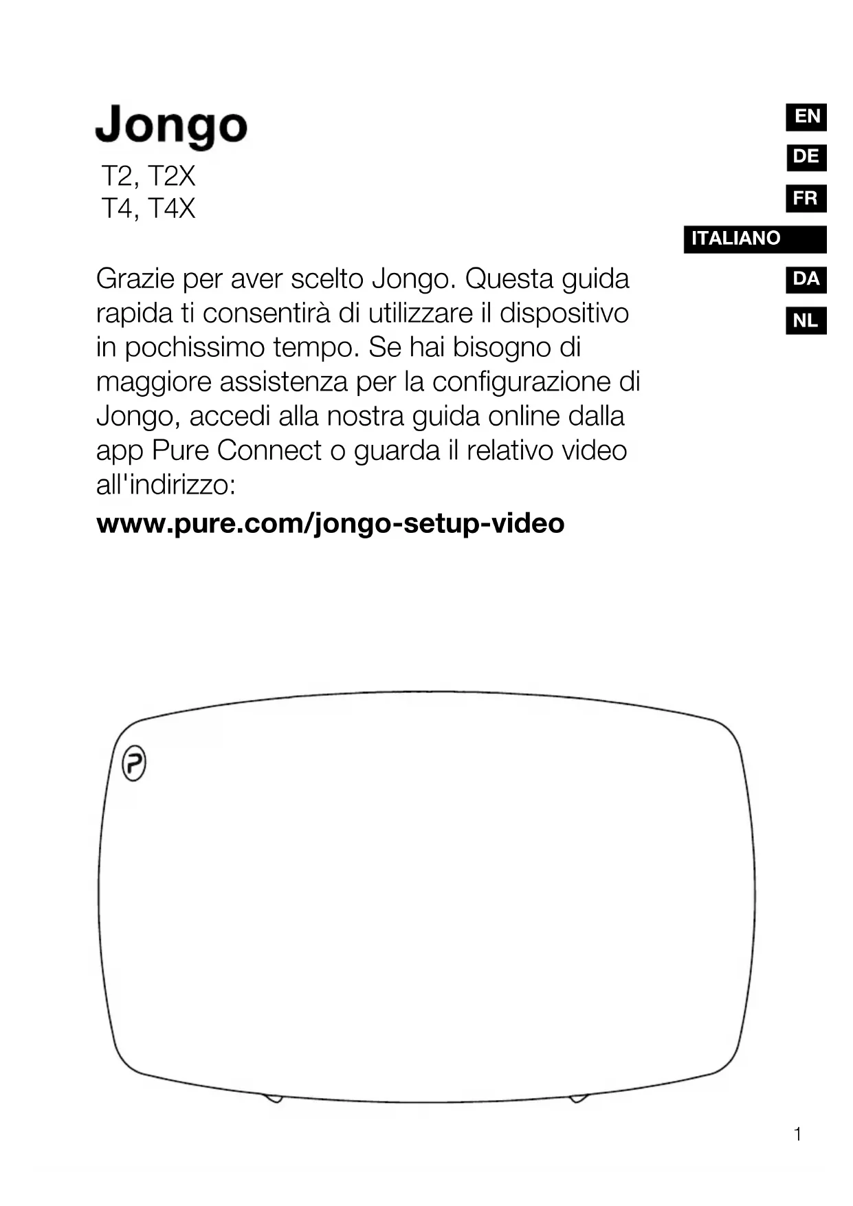 Grazie per aver scelto Jongo. Questa guida rapida ti consentirà di utilizzare il dispositivo in pochissimo tempo. Se hai bisogno di maggiore assistenza per la configurazione di Jongo, accedi alla nostra guida online dalla app Pure Connect o guarda il relativo video all'indirizzo: www.pure.com/jongo-setup-video Jongo_T2X_T4X_QSG-Euro-v2.indb 1 9/16/2014 5:35:32 PM T2, T2X T4, T4X2 Jongo - Istruzioni di sicurezza