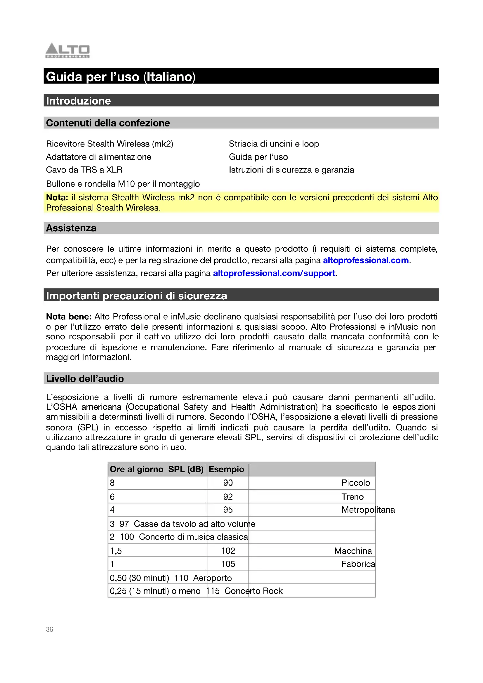 Guida per l’uso (Italiano) Introduzione Contenuti della confezione Ricevitore Stealth Wireless (mk2) Adattatore di alimentazione Cavo da TRS a XLR Bullone e rondella M10 per il montaggio Striscia di uncini e loop Guida per l’uso Istruzioni di sicurezza e garanzia Nota: il sistema Stealth Wireless mk2 non è compatibile con le versioni precedenti dei sistemi Alto Professional Stealth Wireless. Assistenza Per conoscere le ultime informazioni in merito a questo prodotto (i requisiti di sistema complete, compatibilità, ecc) e per la registrazione del prodotto, recarsi alla pagina altoprofessional.com. Per ulteriore assistenza, recarsi alla pagina altoprofessional.com/support. Importanti precauzioni di sicurezza Nota bene: Alto Professional e inMusic declinano qualsiasi responsabilità per l’uso dei loro prodotti o per l’utilizzo errato delle presenti informazioni a qualsiasi scopo. Alto Professional e inMusic non sono responsabili per il cattivo utilizzo dei loro prodotti causato dalla mancata conformità con le procedure di ispezione e manutenzione. Fare riferimento al manuale di sicurezza e garanzia per maggiori informazioni. Livello dell’audio L’esposizione a livelli di rumore estremamente elevati può causare danni permanenti all’udito. L’OSHA americana (Occupational Safety and Health Administration) ha specificato le esposizioni ammissibili a determinati livelli di rumore. Secondo l’OSHA, l’esposizione a elevati livelli di pressione sonora (SPL) in eccesso rispetto ai limiti indicati può causare la perdita dell’udito. Quando si utilizzano attrezzature in grado di generare elevati SPL, servirsi di dispositivi di protezione dell’udito quando tali attrezzature sono in uso. Ore al giorno SPL (dB) Esempio 8 90 Piccolo concerto 6 92 Treno 4 95 Metropolitana 3 97 Casse da tavolo ad alto volume 2 100 Concerto di musica classica 1,5 102 Macchina ribaditrice 1 105 Fabbrica di macchinari 0,50 (30 minuti) 110 Aeroporto 0,25 (15 minuti) o meno 115 Concerto Rock37