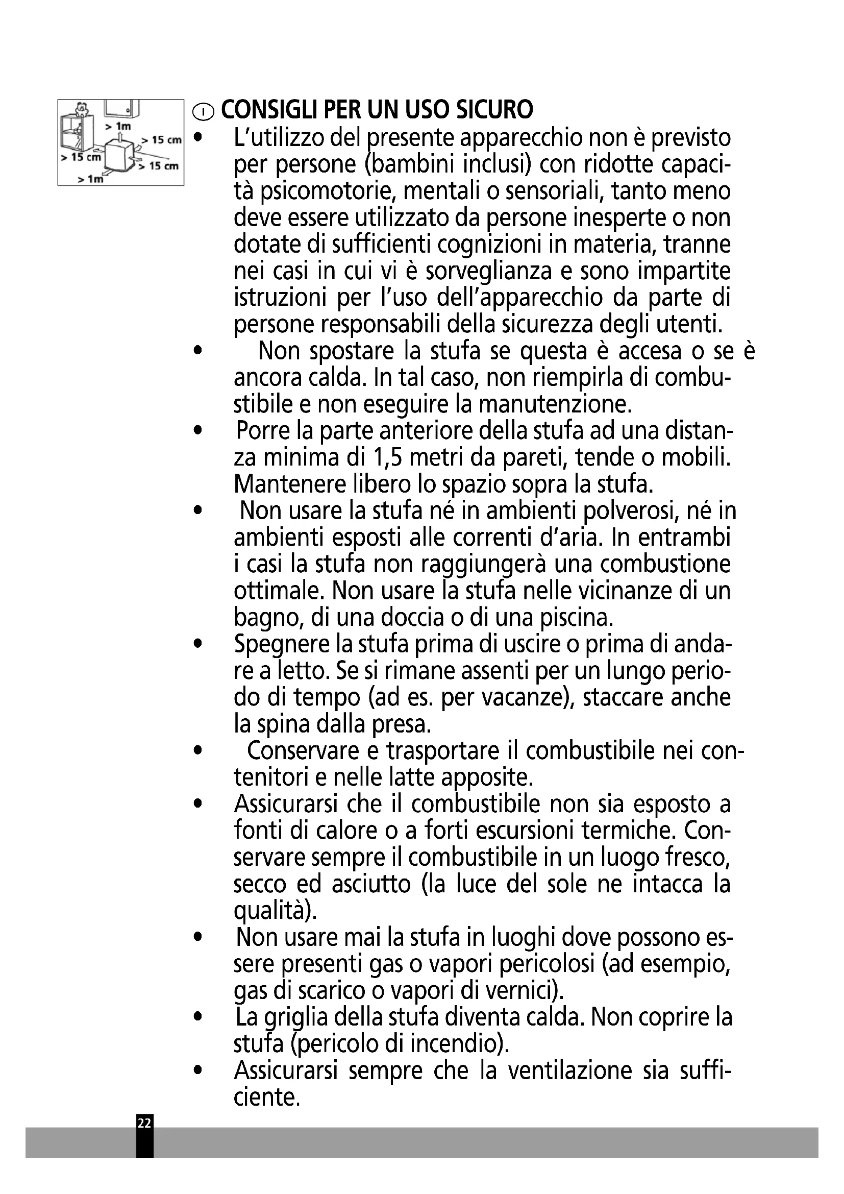 - Porre la parte anteriore della stufa ad una distan- za minima di 1,5 metri da pareti, tende o mobili. Mantenere libero lo spazio sopra la stufa.