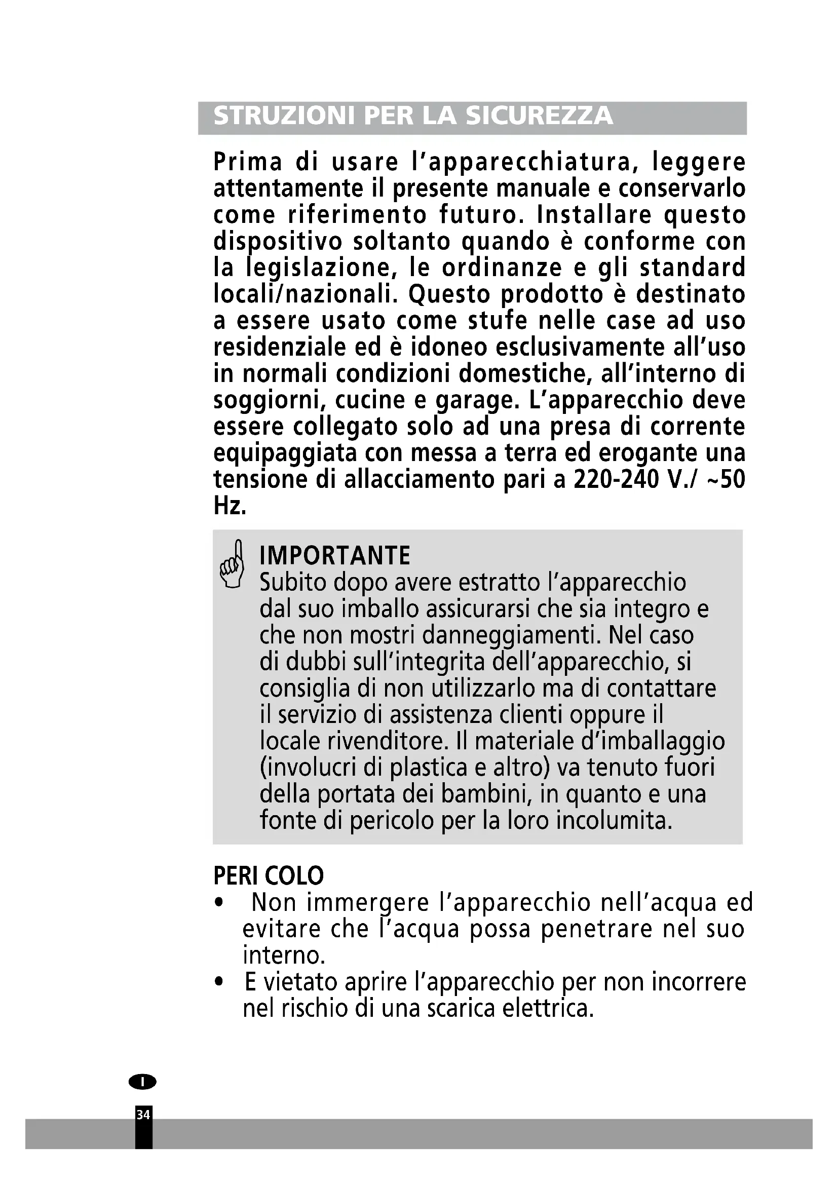 IMPORTANTE Subito dopo avere estratto l’apparecchio dal suo imballo assicurarsi che sia integro e che non mostri danneggiamenti. Nel caso di dubbi sull’integrita dell’apparecchio, si consiglia di non utilizzarlo ma di contattare il servizio di assistenza clienti oppure il locale rivenditore. Il materiale d’imballaggio (involucri di plastica e altro) va tenuto fuori della portata dei bambini, in quanto e una fonte di pericolo per la loro incolumita. PERI COLO