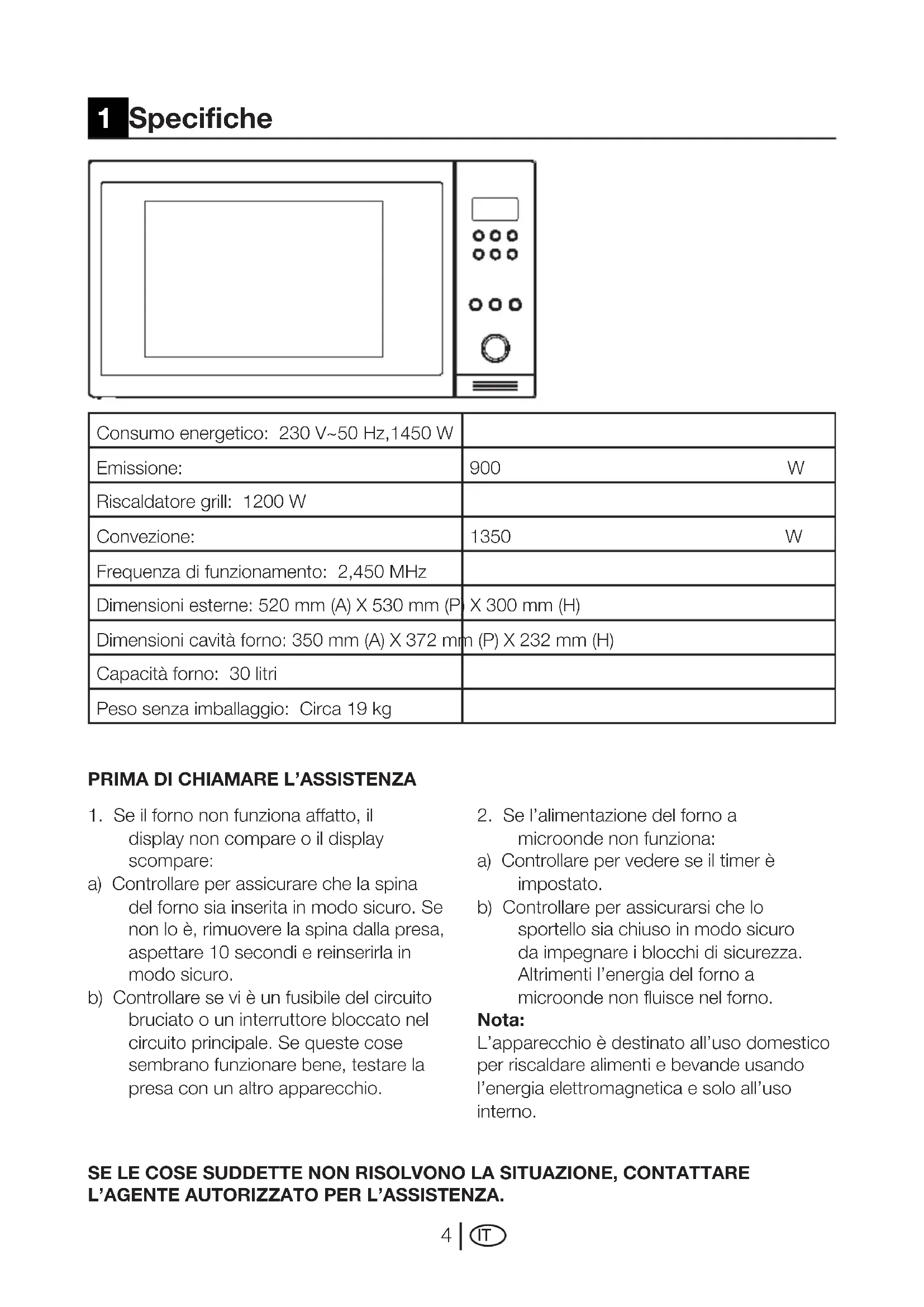 Consumo energetico: 230 V~50 Hz,1450 W Emissione: 900 W Riscaldatore grill: 1200 W Convezione: 1350 W Frequenza di funzionamento: 2,450 MHz Dimensioni esterne: 520 mm (A) X 530 mm (P) X 300 mm (H) Dimensioni cavità forno: 350 mm (A) X 372 mm (P) X 232 mm (H) Capacità forno: 30 litri Peso senza imballaggio: Circa 19 kg 1 Specifiche