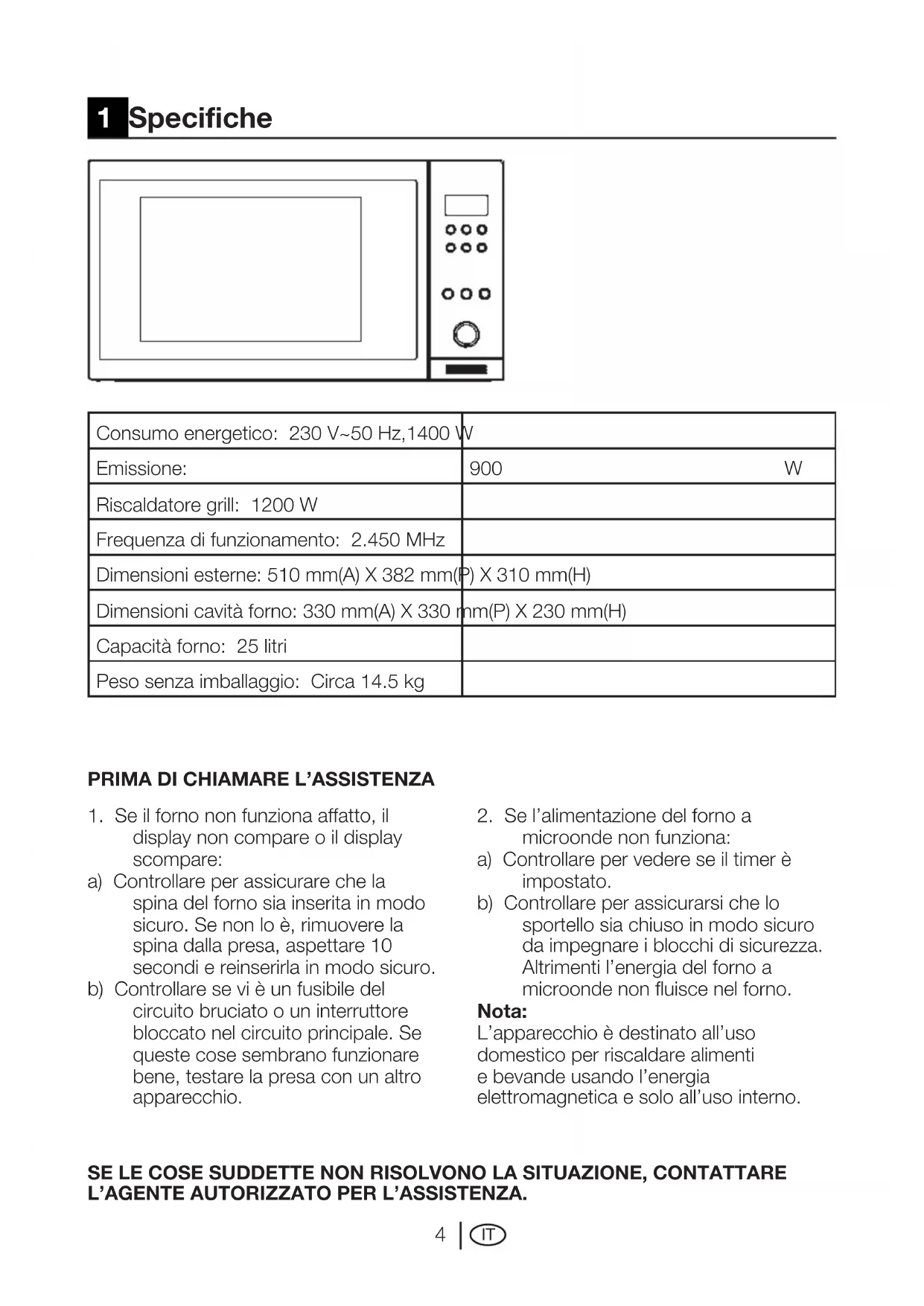 Consumo energetico: 230 V~50 Hz,1400 W Emissione: 900 W Riscaldatore grill: 1200 W Frequenza di funzionamento: 2.450 MHz Dimensioni esterne: 510 mm(A) X 382 mm(P) X 310 mm(H) Dimensioni cavità forno: 330 mm(A) X 330 mm(P) X 230 mm(H) Capacità forno: 25 litri Peso senza imballaggio: Circa 14.5 kg 1 Specifiche