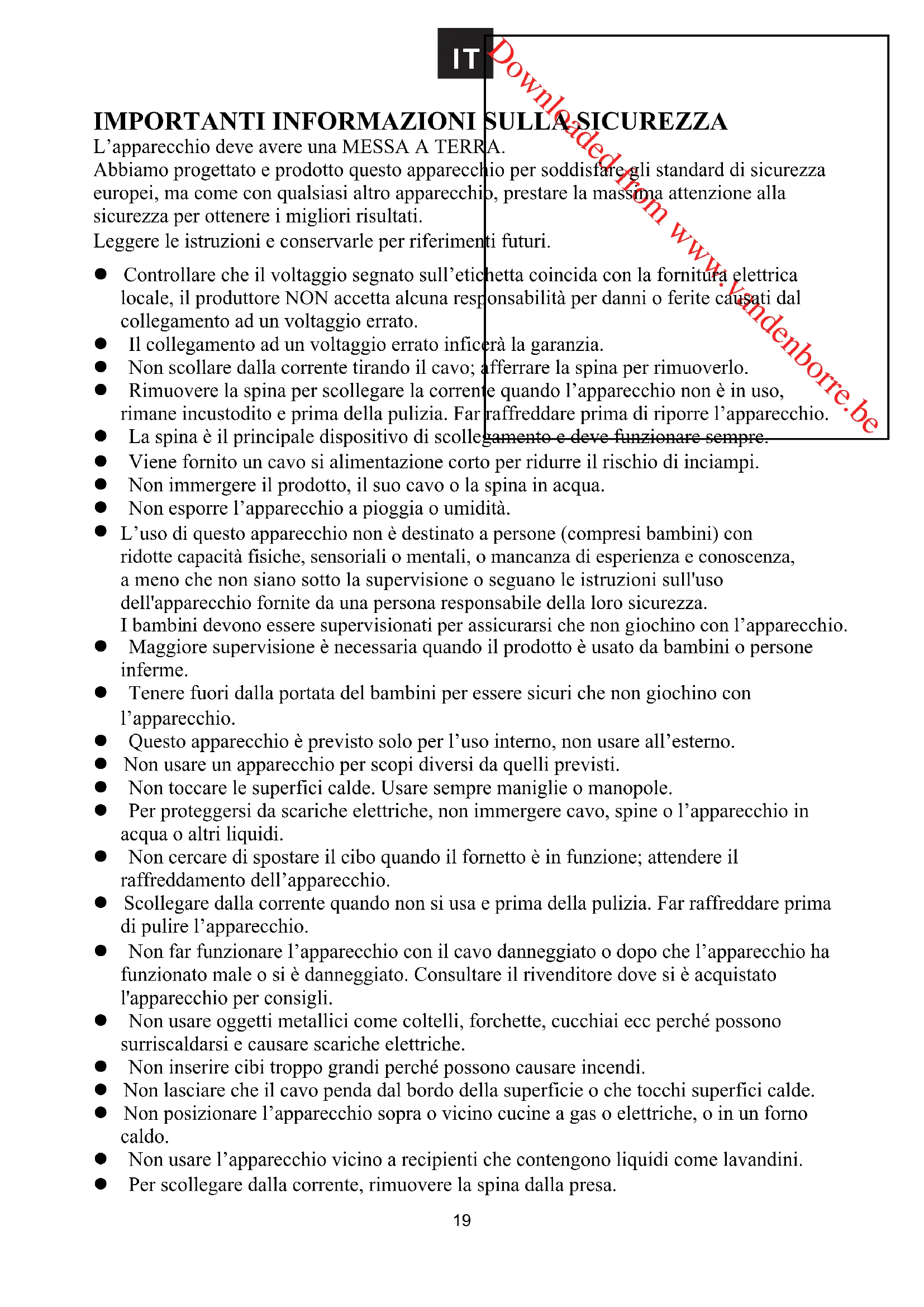 L’uso di questo apparecchio non è destinato a persone (compresi bambini) con ridotte capacità fisiche, sensoriali o mentali, o mancanza di esperienza e conoscenza, a meno che non siano sotto la supervisione o seguano le istruzioni sull'uso dell'apparecchio fornite da una persona responsabile della loro sicurezza. I bambini devono essere supervisionati per assicurarsi che non giochino con l’apparecchio.Downloaded from www.vandenborre.be z Non usare accessori non consigliati dal produttore onde evitare pericoli da incendio, scariche elettriche o ferite. z Non inserire articoli avvolti nella carta stagnola nel forno. z Rimuovere tutti gli involucri protettivi prima di inserirli nel forno. z Questo apparecchio NON è previsto per funzionare con un timer esterno o un sistema di telecomando esterno. ATTENZIONE: Superfici calde. Le temperature delle superfici accessibili tendono a diventare calde durante l’uso. AVVERTENZE: z Questo apparecchio è previsto solo per l’uso domestico. L’uso commerciale o qualsiasi altro uso può invalidare la garanzia ed essere pericoloso. z Se il cavo di alimentazione è danneggiato, deve essere sostituito dal produttore, da un suo tecnico qualificato o da una persona qualificata onde evitare pericoli. z Non usare l’apparecchio nelle vicinanze di bagni o lavandini o altri recipienti contenenti acqua o altri liquidi. Se l’apparecchio cade in acqua non recuperarlo, spegnerlo e scollegarlo dalla corrente e far scolare l’acqua prima di recuperarlo, non usare nuovamente l’apparecchio finché non sia stato controllato da un tecnico qualificato. z Le superfici accessibili si surriscaldano durante il funzionamento, usare sempre maniglie e manopole.