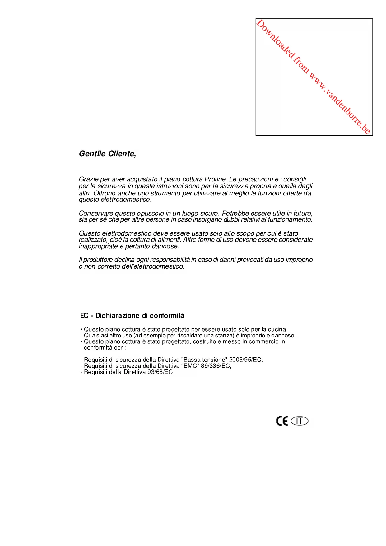 Grazie per aver acquistato il piano cottura Proline. Le precauzioni e i consigli per la sicurezza in queste istruzioni sono per la sicurezza propria e quella degli altri. Offrono anche uno strumento per utilizzare al meglio le funzioni offerte da questo elettrodomestico. Conservare questo opuscolo in un luogo sicuro. Potrebbe essere utile in futuro, sia per sé che per altre persone in caso insorgano dubbi relativi al funzionamento. Questo elettrodomestico deve essere usato solo allo scopo per cui è stato realizzato, cioè la cottura di alimenti. Altre forme di uso devono essere considerate inappropriate e pertanto dannose. Il produttore declina ogni responsabilità in caso di danni provocati da uso improprio o non corretto dell'elettrodomestico. EC - Dichiarazione di conformità