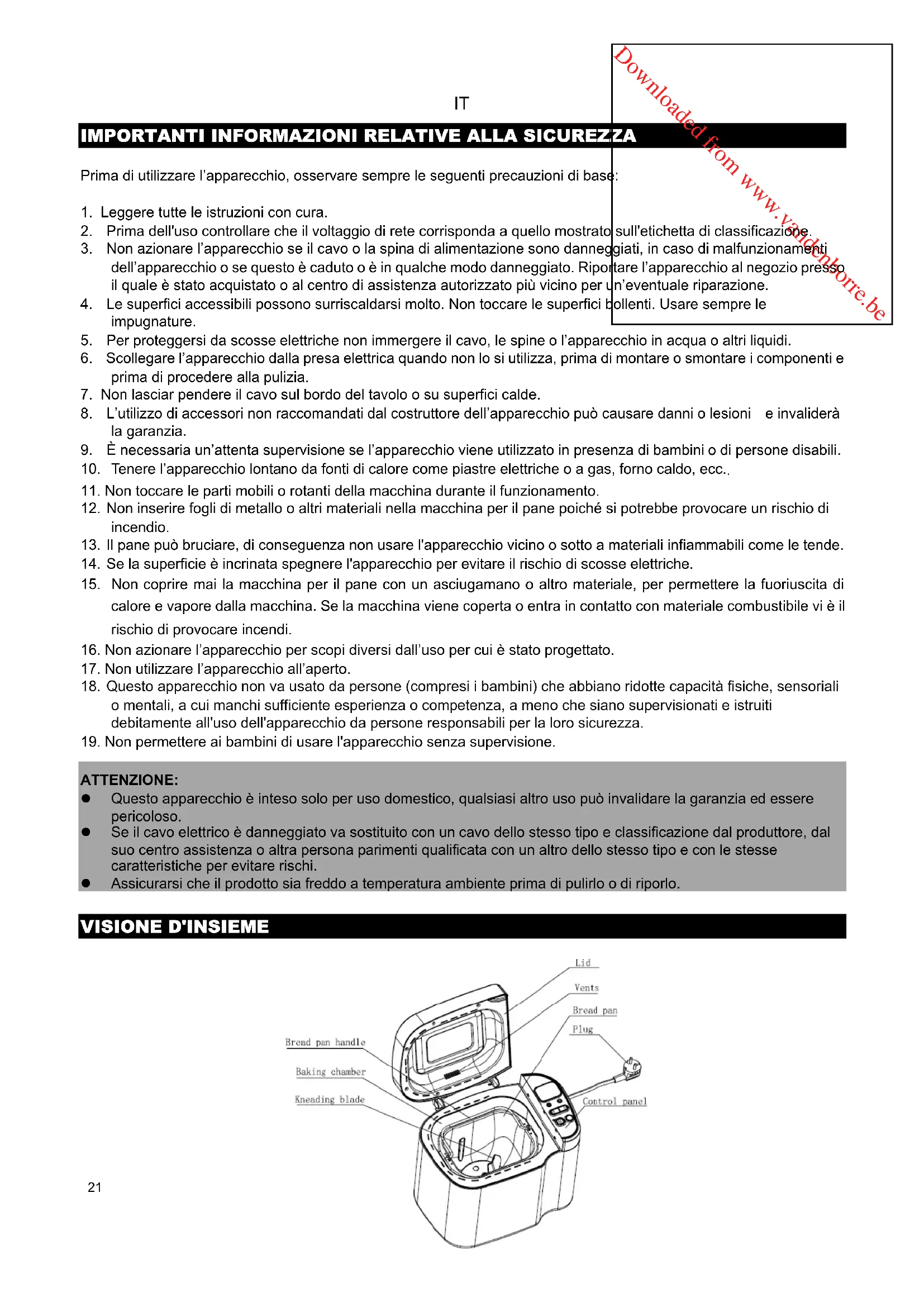 ATTENZIONE: z Questo apparecchio è inteso solo per uso domestico, qualsiasi altro uso può invalidare la garanzia ed essere pericoloso. z Se il cavo elettrico è danneggiato va sostituito con un cavo dello stesso tipo e classificazione dal produttore, dal suo centro assistenza o altra persona parimenti qualificata con un altro dello stesso tipo e con le stesse caratteristiche per evitare rischi. z Assicurarsi che il prodotto sia freddo a temperatura ambiente prima di pulirlo o di riporlo. VISIONE D'INSIEME 21Downloaded from www.vandenborre.be