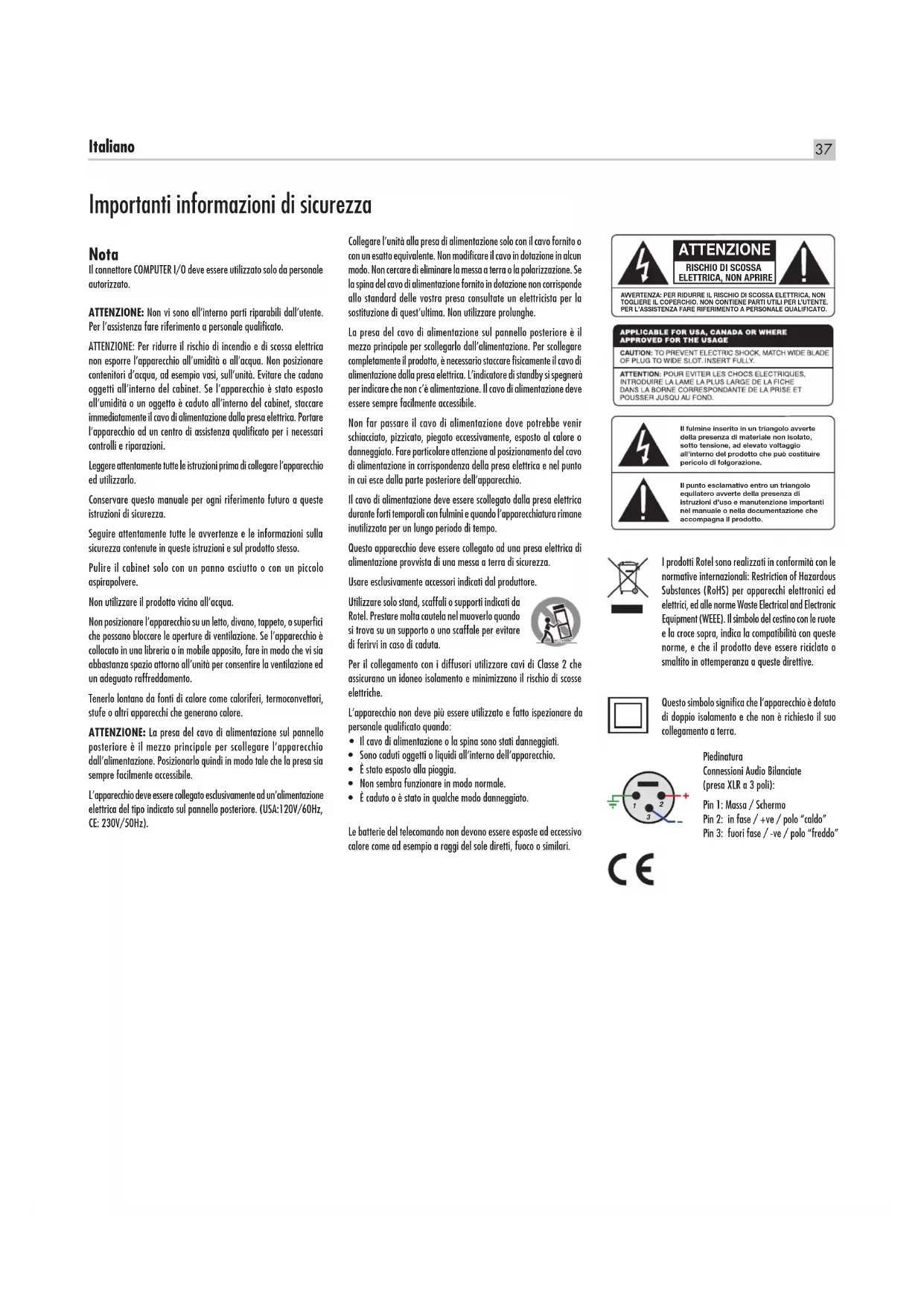 PC-USB Formaat Opmerkingen Formaat bepaalddoor de door u gebruikte mediaspeler- serversoftware. Alle formaten ondersteund door de PC-software 44,1K, 48k, 88,2K, 96K, 176,4K, 192K, 16 bit, 24 bit. Coax/Optisch Formaat Opmerkingen SPDIF LPCM 44,1K, 48k, 88,2K, 96K, 176,4K, 16 bit, 24 bit37 Italiano Nota Il connettore COMPUTER I/O deve essere utilizzato solo da personale autorizzato. ATTENZIONE: Non vi sono all’interno parti riparabili dall’utente. Per l’assistenza fare riferimento a personale qualificato. ATTENZIONE: Per ridurre il rischio di incendio e di scossa elettrica non esporre l’apparecchio all’umidità o all’acqua. Non posizionare contenitori d’acqua, ad esempio vasi, sull’unità. Evitare che cadano oggetti all’interno del cabinet. Se l’apparecchio è stato esposto all’umidità o un oggetto è caduto all’interno del cabinet, staccare immediatamente il cavo di alimentazione dalla presa elettrica. Portare l’apparecchio ad un centro di assistenza qualificato per i necessari controlli e riparazioni. Leggere attentamente tutte le istruzioni prima di collegare l’apparecchio ed utilizzarlo. Conservare questo manuale per ogni riferimento futuro a queste istruzioni di sicurezza. Seguire attentamente tutte le avvertenze e le informazioni sulla sicurezza contenute in queste istruzioni e sul prodotto stesso. Pulire il cabinet solo con un panno asciutto o con un piccolo aspirapolvere. Non utilizzare il prodotto vicino all’acqua. Non posizionare l’apparecchio su un letto, divano, tappeto, o superfici che possano bloccare le aperture di ventilazione. Se l’apparecchio è collocato in una libreria o in mobile apposito, fare in modo che vi sia abbastanza spazio attorno all’unità per consentire la ventilazione ed un adeguato raffreddamento. Tenerlo lontano da fonti di calore come caloriferi, termoconvettori, stufe o altri apparecchi che generano calore. ATTENZIONE: La presa del cavo di alimentazione sul pannello posteriore è il mezzo principale per scollegare l’apparecchio dall’alimentazione. Posizionarlo quindi in modo tale che la presa sia sempre facilmente accessibile. L’apparecchio deve essere collegato esclusivamente ad un’alimentazione elettrica del tipo indicato sul pannello posteriore. (USA:120V/60Hz, CE: 230V/50Hz). I prodotti Rotel sono realizzati in conformità con le normative internazionali: Restriction of Hazardous Substances (RoHS) per apparecchi elettronici ed elettrici, ed alle norme Waste Electrical and Electronic Equipment (WEEE). Il simbolo del cestino con le ruote e la croce sopra, indica la compatibilità con queste norme, e che il prodotto deve essere riciclato o smaltito in ottemperanza a queste direttive. Importanti informazioni di sicurezza Collegare l’unità alla presa di alimentazione solo con il cavo fornito o con un esatto equivalente. Non modificare il cavo in dotazione in alcun modo. Non cercare di eliminare la messa a terra o la polarizzazione. Se la spina del cavo di alimentazione fornito in dotazione non corrisponde allo standard delle vostra presa consultate un elettricista per la sostituzione di quest’ultima. Non utilizzare prolunghe. La presa del cavo di alimentazione sul pannello posteriore è il mezzo principale per scollegarlo dall’alimentazione. Per scollegare completamente il prodotto, è necessario staccare fisicamente il cavo di alimentazione dalla presa elettrica. L’indicatore di standby si spegnerà per indicare che non c’è alimentazione. Il cavo di alimentazione deve essere sempre facilmente accessibile. Non far passare il cavo di alimentazione dove potrebbe venir schiacciato, pizzicato, piegato eccessivamente, esposto al calore o danneggiato. Fare particolare attenzione al posizionamento del cavo di alimentazione in corrispondenza della presa elettrica e nel punto in cui esce dalla parte posteriore dell’apparecchio. Il cavo di alimentazione deve essere scollegato dalla presa elettrica durante forti temporali con fulmini e quando l’apparecchiatura rimane inutilizzata per un lungo periodo di tempo. Questo apparecchio deve essere collegato ad una presa elettrica di alimentazione provvista di una messa a terra di sicurezza. Usare esclusivamente accessori indicati dal produttore. Utilizzare solo stand, scaffali o supporti indicati da Rotel. Prestare molta cautela nel muoverlo quando si trova su un supporto o uno scaffale per evitare di ferirvi in caso di caduta. Per il collegamento con i diffusori utilizzare cavi di Classe 2 che assicurano un idoneo isolamento e minimizzano il rischio di scosse elettriche. L’apparecchio non deve più essere utilizzato e fatto ispezionare da personale qualificato quando: