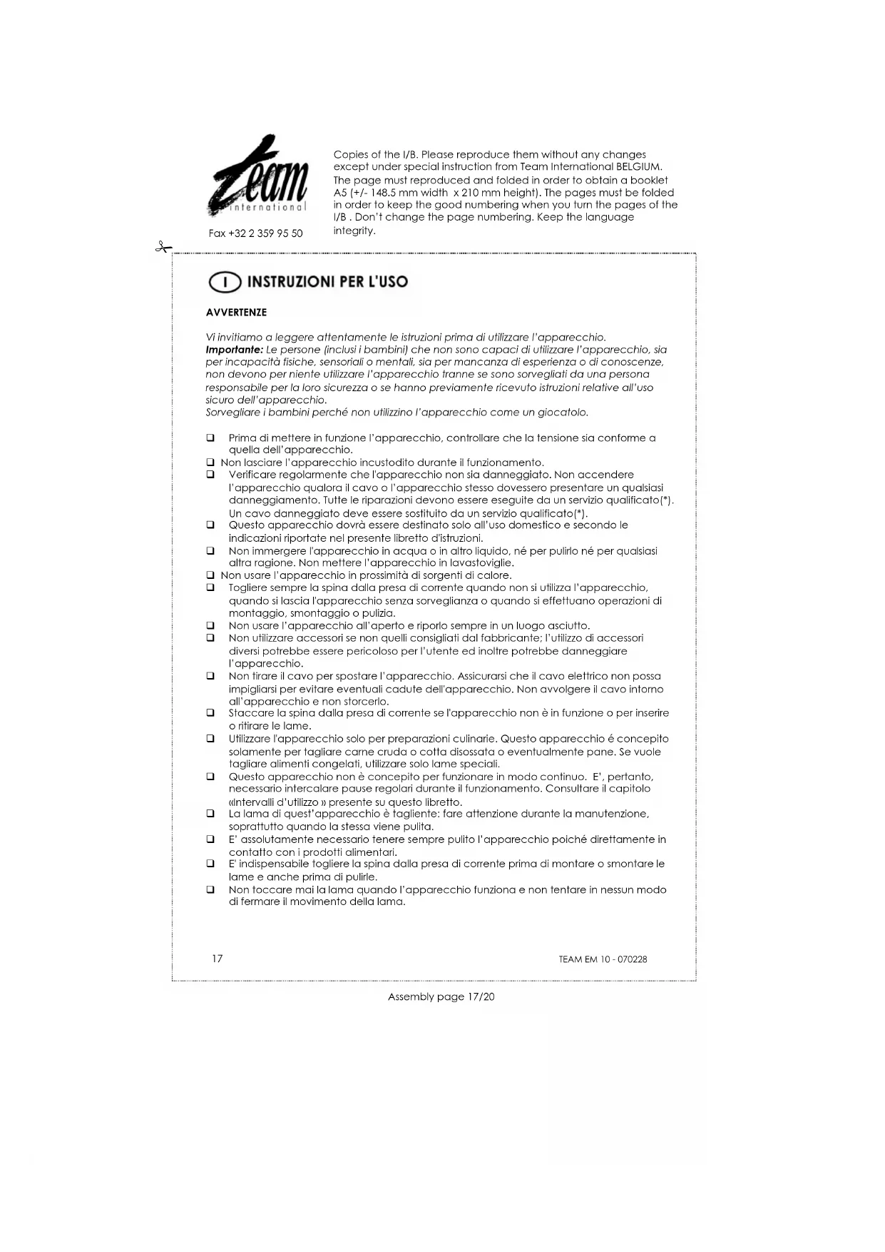 DIRETTIVA 2002/96/CE PER LO SMALTIMENTO DELLE APPARECCHIATURE ELETTRICHE ED ELETTRONICHE Per preservare l'ambiente e la nostra salute, l'eliminazione dei vecchi apparecchi elettrici e elettronici non più utilizzati, va fatta secondo la direttiva sopra citata che impone l'obbligo al costruttore, al commerciante e a l'utilizzatore di consegnare gli apparecchi ai centri di raccolta specializzati, i quali saranno in grado di smaltire e riciclare i vecchi prodotti come la legge prescrive. Per questa ragione troverete apposto sulla etichetta segnaletica il simbolo che indica di non gettare il vecchio apparecchio non più utilizzato, in pattumiera o nel cassonetto delle immondizie. Per eliminare il vecchio apparecchio non più utilizzato, potete consegnarlo al rivenditore il cambio di quello nuovo acquistato, o direttamente nei centri di raccolta specializzati messi a disposizione dal vostro comune di residenzaCopies of the I/B. Please reproduce them without any changes except under special instruction from Team International BELGIUM. The page must be reproduced and folded in order to obtain a mini booklet A5 (+/- 148.5 mm width x 210 mm height). The pages must be folded in order to keep the good numbering when you turn the pages of the I/B . Don’t change the page numbering. Keep the language integrity.
