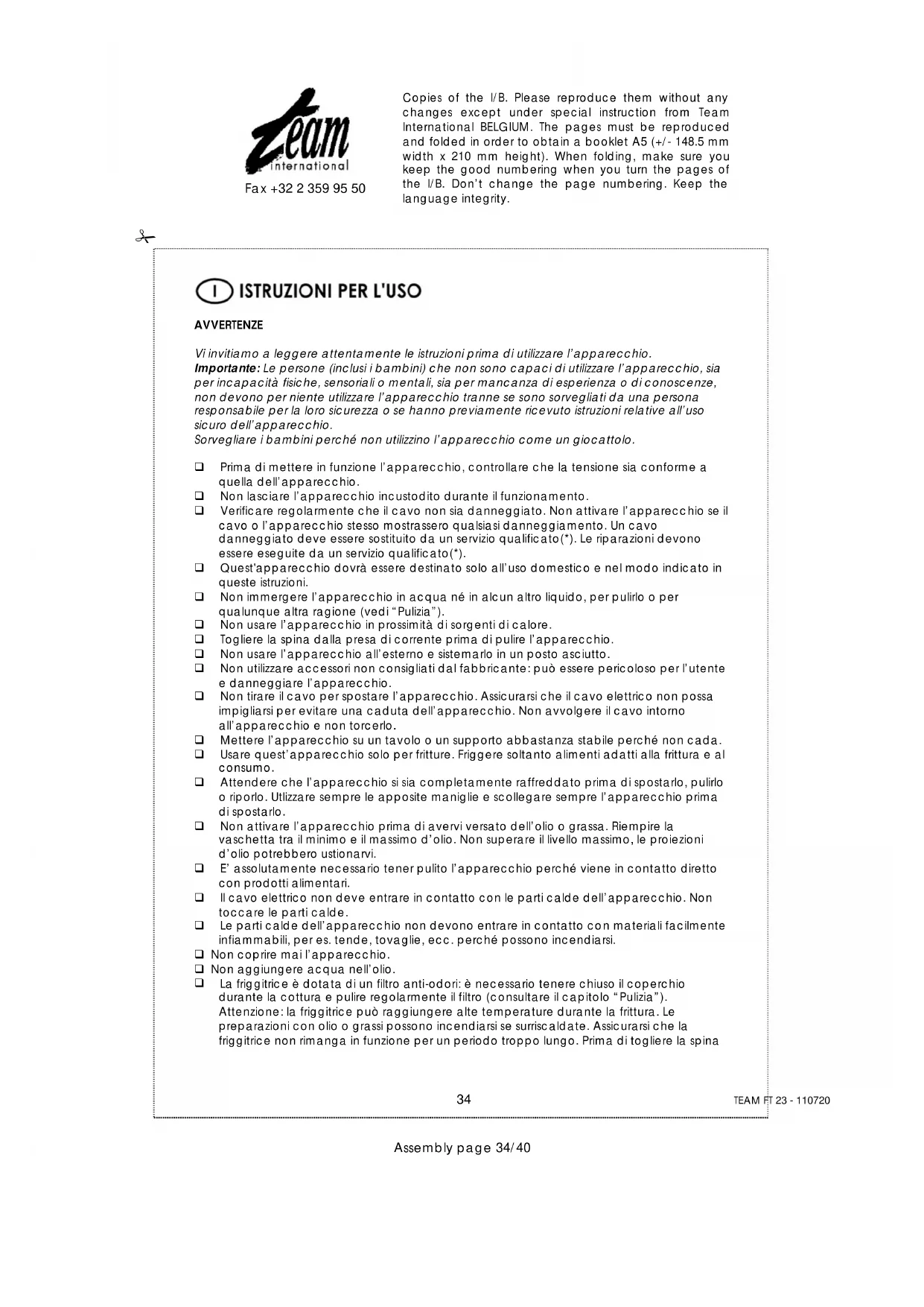 Assembly page 34/40 Copies of the I/B. Please reproduce them without any changes except under special instruction from Team International BELGIUM. The pages must be reproduced and folded in order to obtain a booklet A5 (+/- 148.5 mm width x 210 mm height). When folding, make sure you keep the good numbering when you turn the pages of the I/B. Don’t change the page numbering. Keep the language integrity. Fax +32 2 359 95 50 dalla presa di corrente, posizionare l’interruttore sulla posizione “OFF” e il termostato sulla posizione “MIN”. Ventilare la stanza durante la frittura. Se si vogliono utilizzare grassi solidi, tagliarli in piccoli pezzi e metterli nella vaschetta. Posizionare la manopola della temperatura sul minimo e accendere l’apparecchio portando l’interruttore sulla posizione “ON”. Ogni volta che la spia di temperatura si spegne, aumentare leggermente la temperatura fino a quando tutto il grasso si scioglie. Una volta il grasso completamente sciolto, regolare il termostato sulla temperatura desiderata. Questo tipo di grasso si solidifica quando la temperatura si abbassa. L’apparecchio non deve mai essere accesso tramite un timer esterno o un altro sistema di comando a distanza separato. (*) Servizio qualificato: Servizio Assistenza del fabbricante o dell'importatore o una persona qualificata, riconosciuta e autorizzata ad effettuare riparazioni, per evitare ogni pericolo. Inviare in ogni caso l’apparecchio a questo servizio.