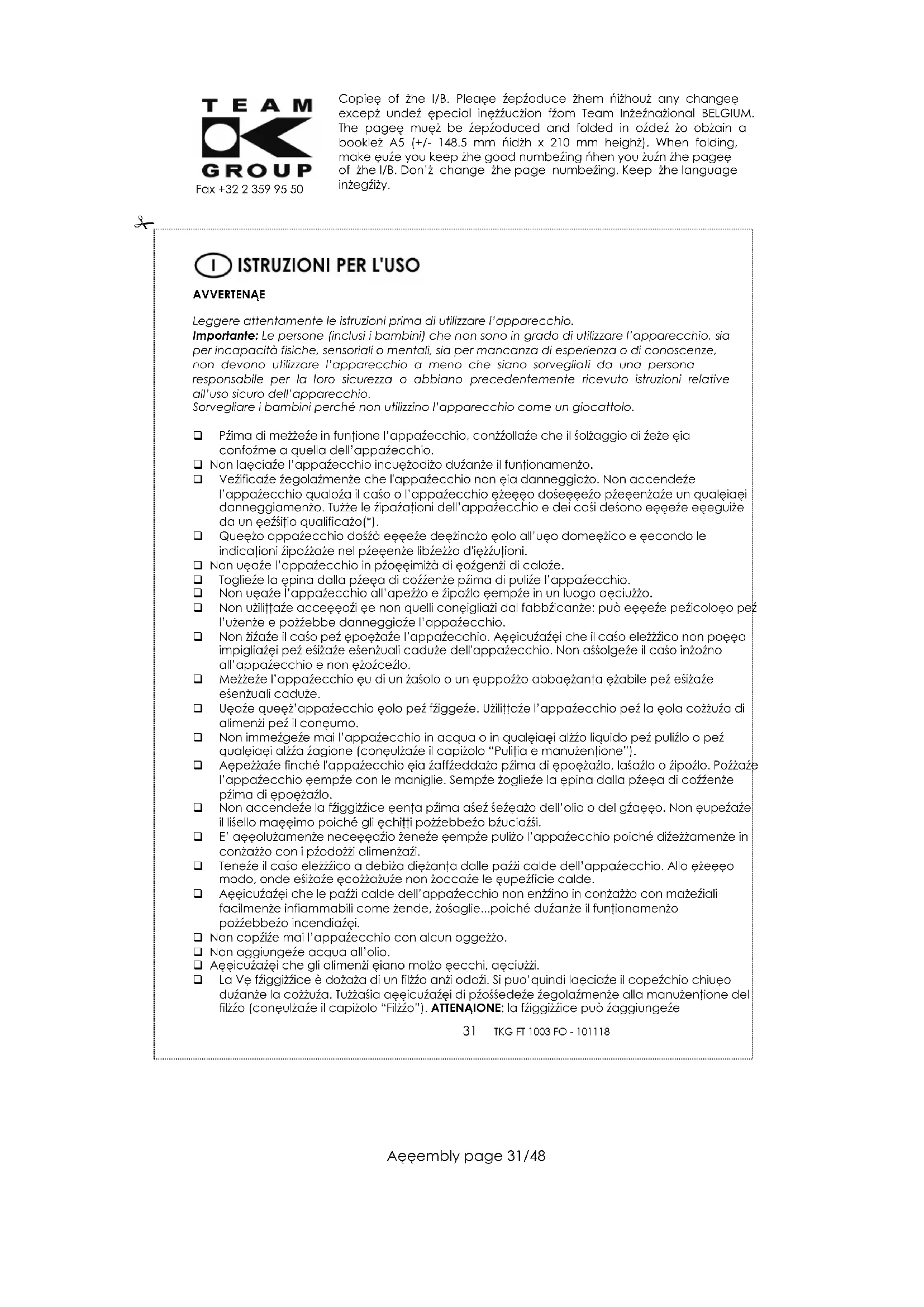 Fax +32 2 359 95 50 DIRETTIVA 2002/96/CE PER LO SMALTIMENTO DELLE APPARECCHIATURE ELETTRICHE ED ELETTRONICHE Per preservare l'ambiente e la nostra salute, i vecchi apparecchi elettrici e elettronici non più utilizzati devono essere smaltiti secondo la direttiva sopra citata che impone l'obbligo al costruttore, al commerciante e all'utilizzatore di consegnare gli apparecchi ai centri di raccolta specializzati, i quali saranno in grado di smaltire e riciclare i vecchi prodotti come la legge prescrive. Per questa ragione troverete apposto sulla targhetta identificativa o sull'imballaggio il simbolo che indica di non gettare il vecchio apparecchio in pattumiera o nel cassonetto delle immondizie. Per eliminare il vecchio apparecchio non più utilizzato, potete consegnarlo al rivenditore il cambio di quello nuovo acquistato, o direttamente nei centri di raccolta specializzati messi a disposizione dal vostro comune di residenza.Copies of the I/B. Please reproduce them without any changes except under special instruction from Team International BELGIUM. The pages must be reproduced and folded in order to obtain a booklet A5 (+/- 148.5 mm width x 210 mm height). When folding, make sure you keep the good numbering when you turn the pages of the I/B. Don’t change the page numbering. Keep the language integrity.